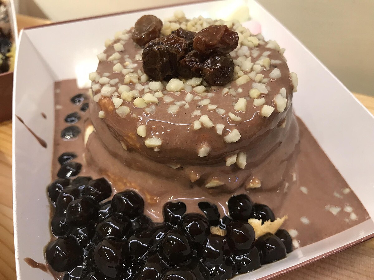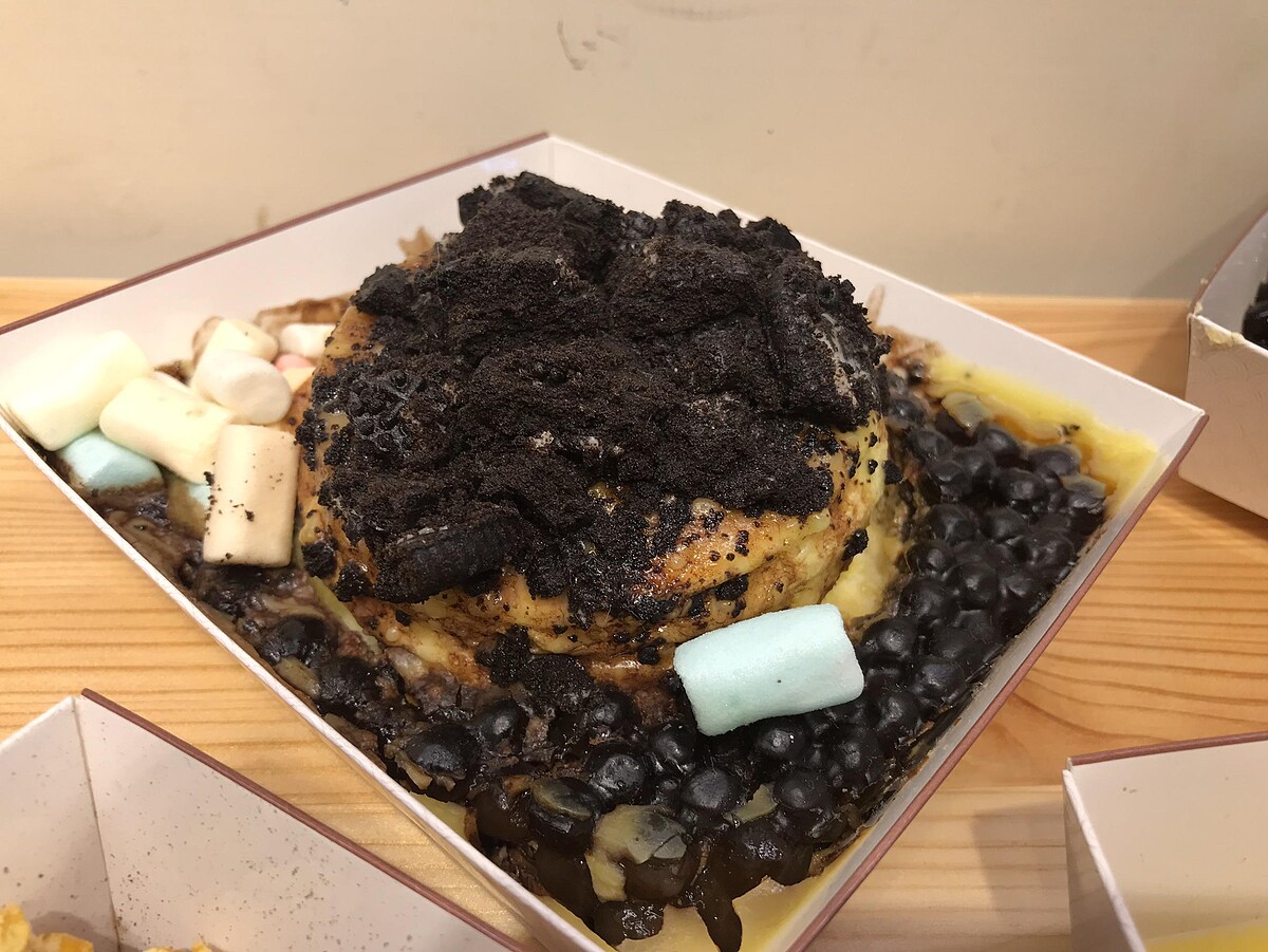 淋上卡士達醬加巧克力醬再加上OREO巧克力碎片、棉花糖、黑糖珍珠,適合螞蟻人享用!