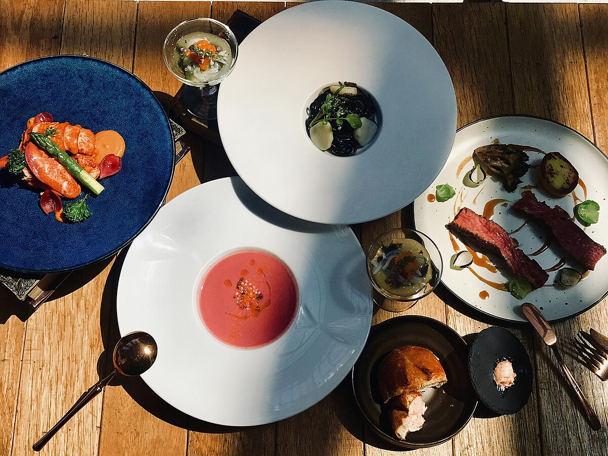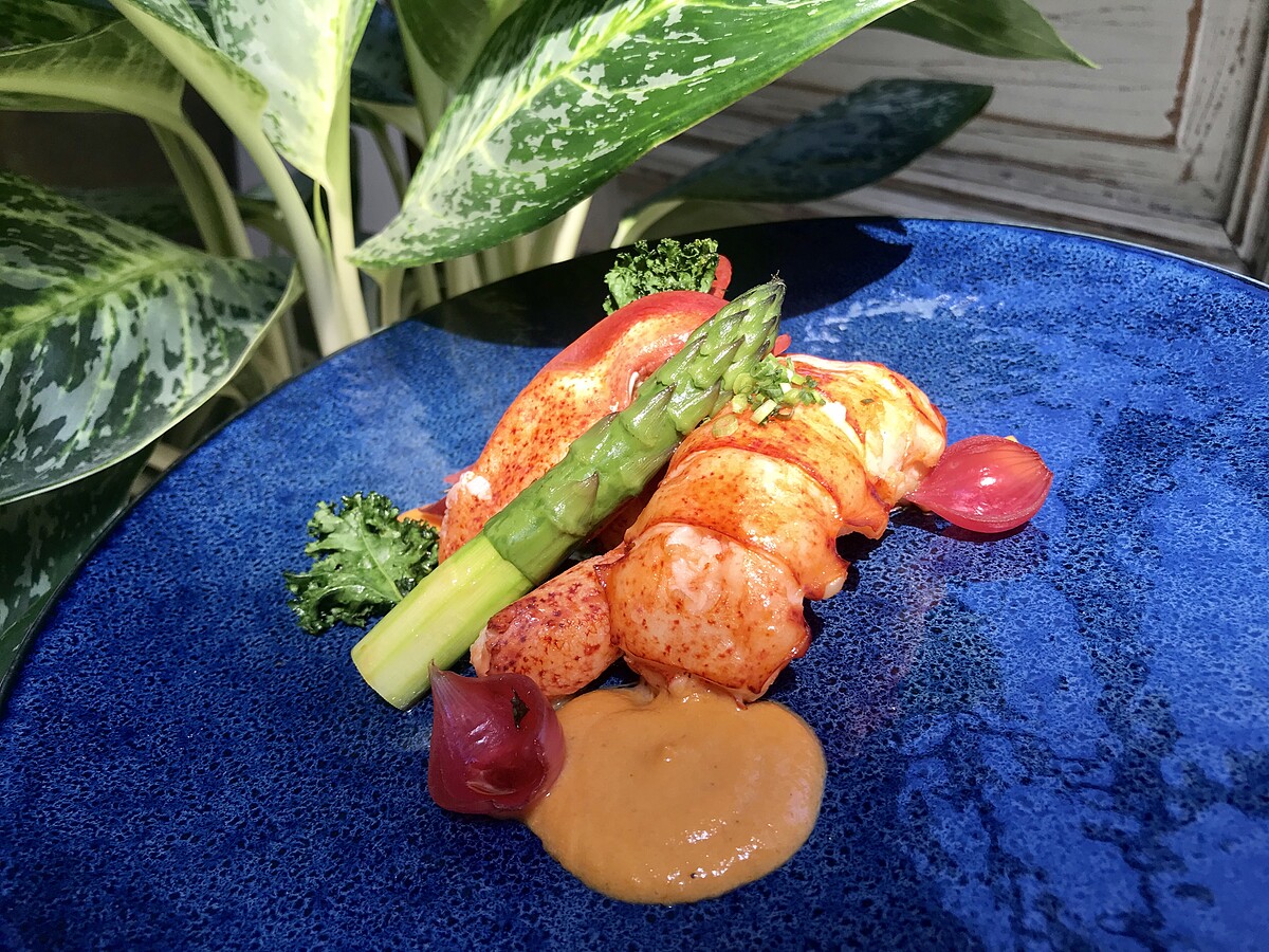 以油泡方式讓肉質更加軟嫩,龍蝦醬使用蝦頭的精華,搭配番茄、蒜頭而煮而成,建議龍蝦肉可以沾取享用,品嚐起來會更加鮮美!上面放置美國蘆筍非常鮮甜,搭配超級食物羽衣甘藍,還有一個解膩配方,就是旁邊粉色的珍珠洋蔥,使用紅酒醋以及甜菜跟製作成浪漫粉色!