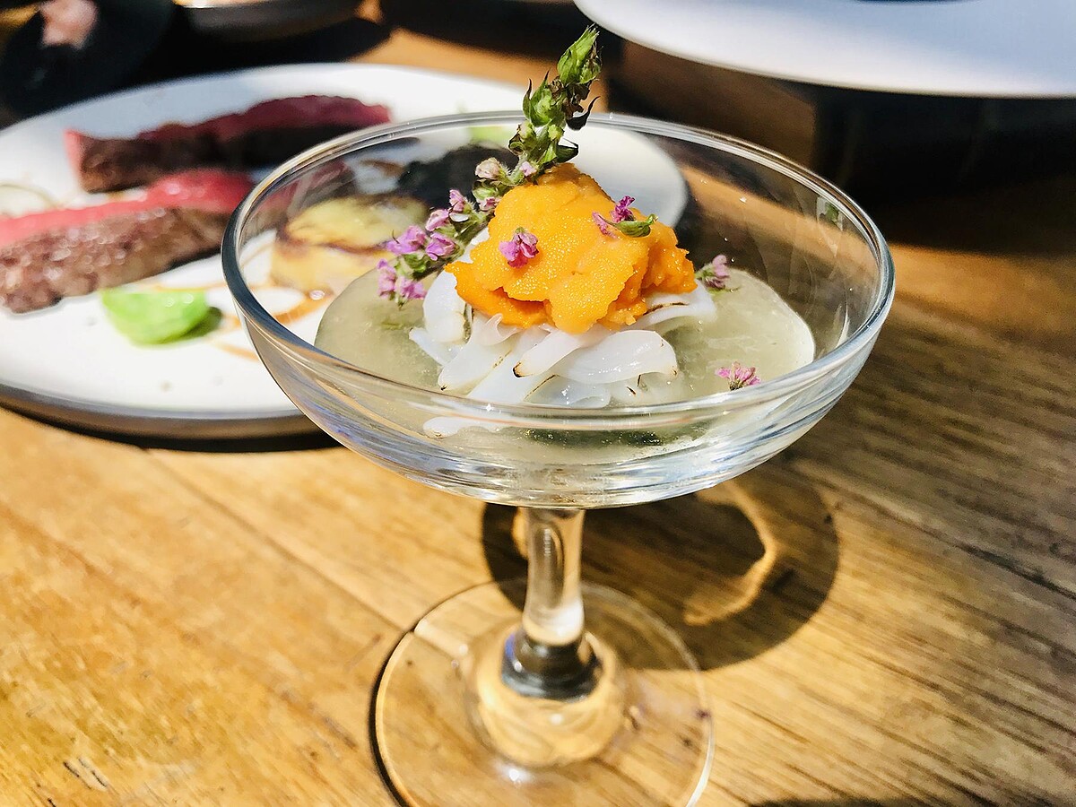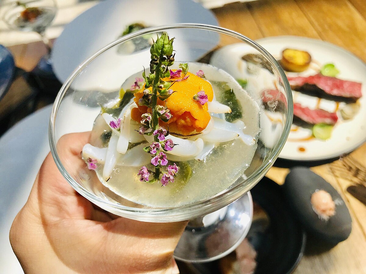 開胃菜以梅子製作成醋凍,再搭配海帶芽、烤過的花枝,再加上海味十足的海膽,以及可食用的紫蘇花,建議大家扮再一起吃,品嚐起來帶有微微紫蘇花香氣,整體酸甜又開胃!