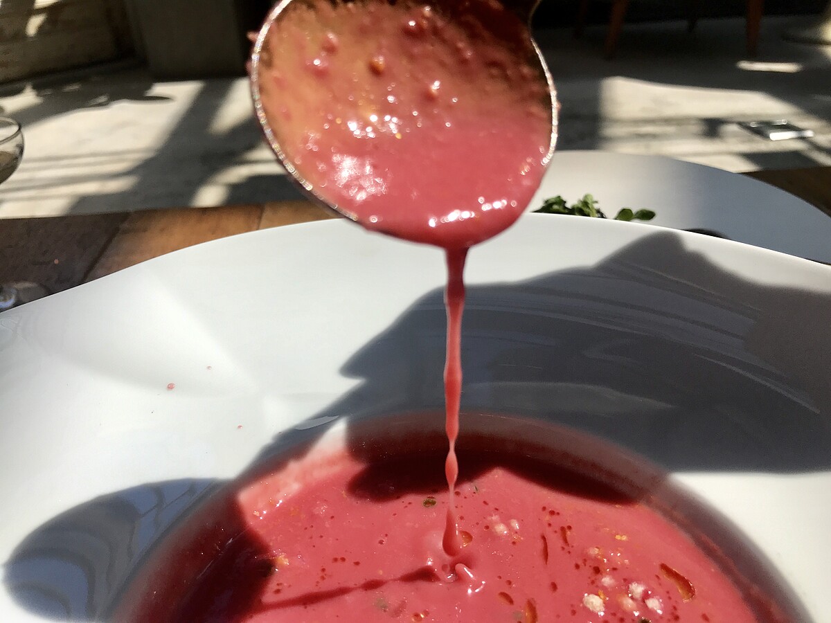 這道湯品非常適合充滿粉紅色泡泡的情人節,湯的主體玉米為主,粉紅色是以以甜菜根的天然顏色去調製而成!