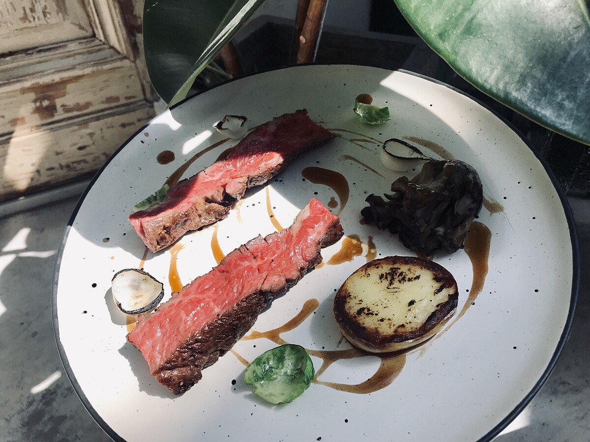 上蓋牛肉是肋眼牛排的精華部位,數量稀少、油脂花紋分布均勻,肉質滑嫩鮮甜,先用稻草燻過,會帶微微稻燻味,在煎至三分到五分熟,若是不敢品嚐這種熟度也可以告知主廚,但三分到五分熟是主廚最推薦品嚐的熟度,醬汁是牛肉高湯,吃起來很滿足!