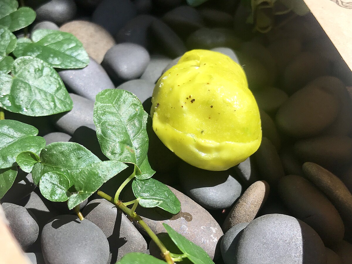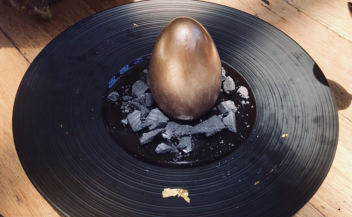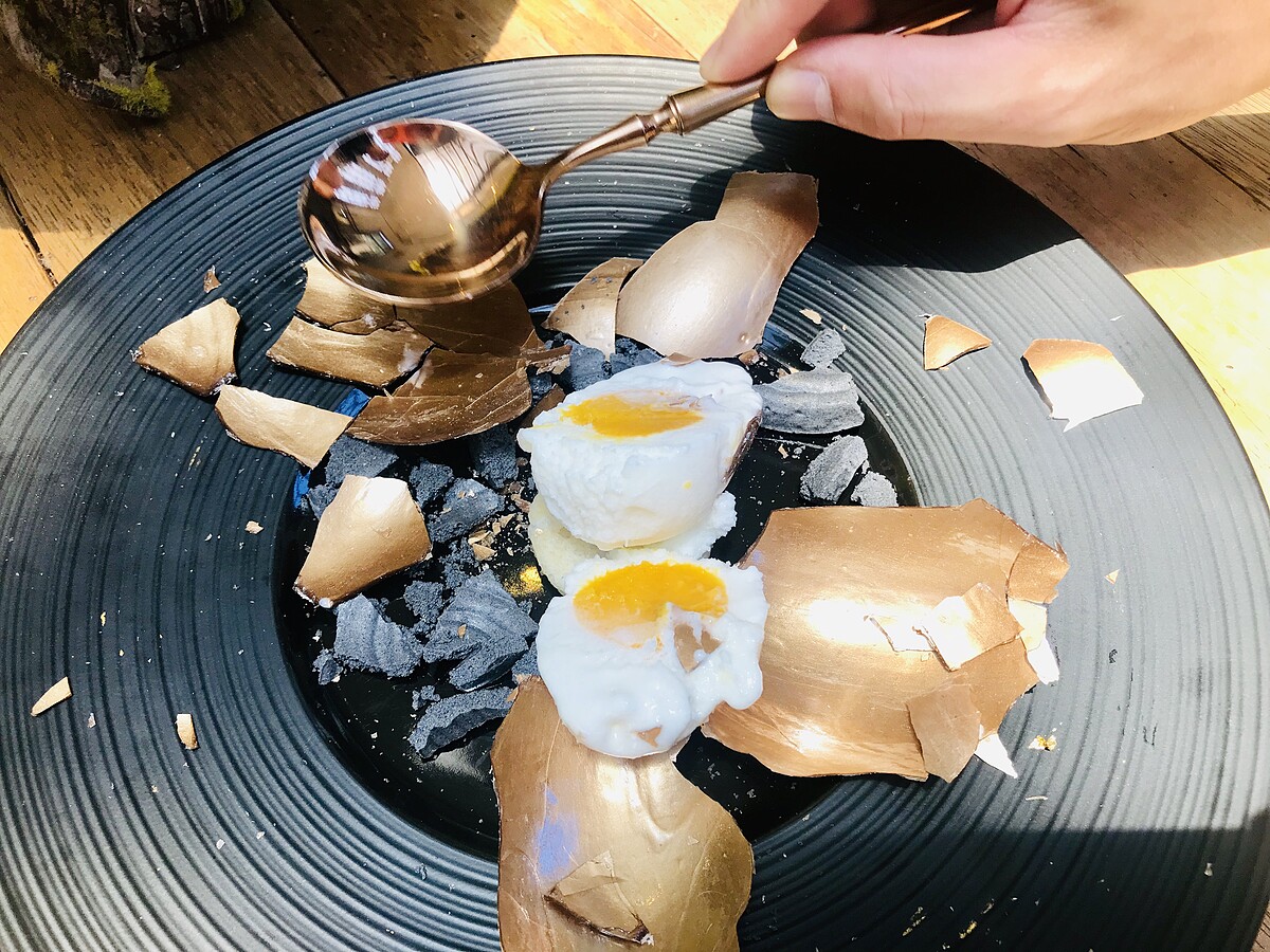 外觀已完全神還原金雞蛋本人,必須用力敲碎,會發現裡面居然蛋中有蛋,而且裡面這個但還是椰子、熱帶水果口味的冰淇淋,帶有濃郁芒果香甜、百香果的微酸,香蕉的香氣,最底下還有杏仁蛋糕,旁邊的岩石是加入竹炭的蛋白霜餅。