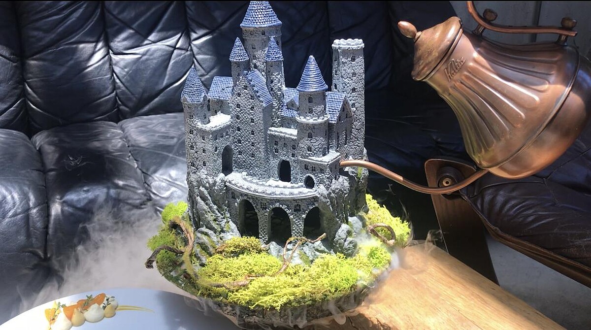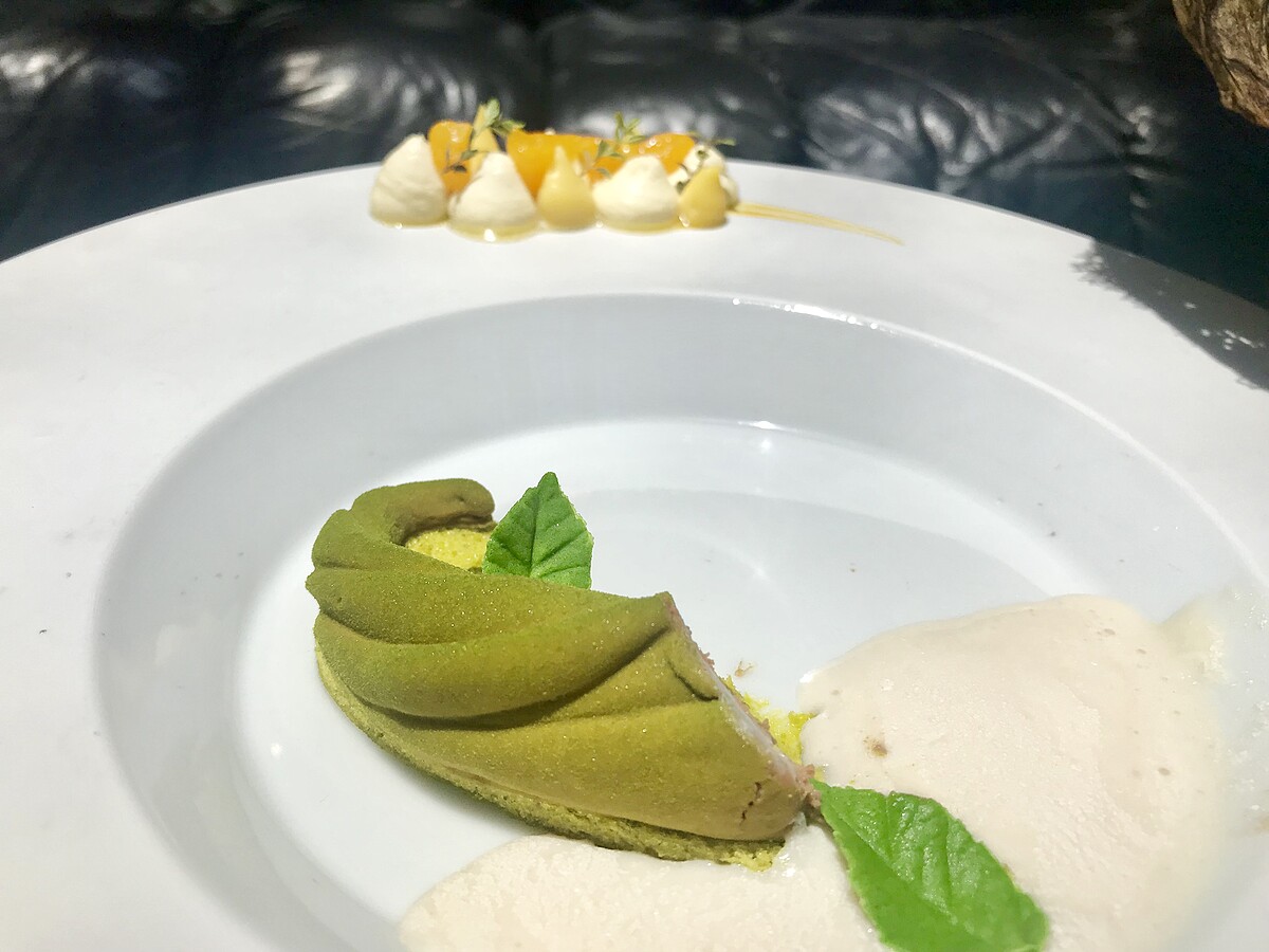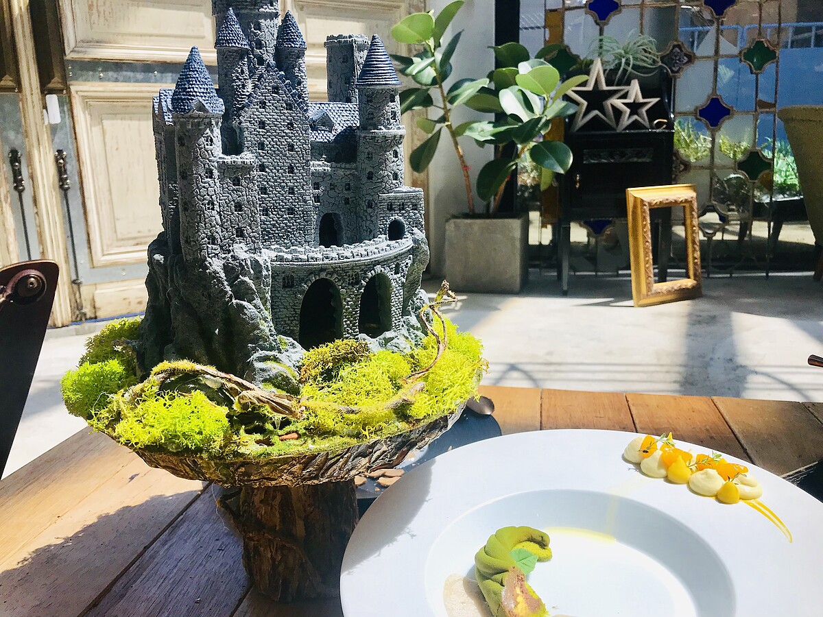 這道甜點最大的亮點就是會冒煙的城堡,當乾冰倒入的瞬間,真的會以為自己就是主人公傑克看到巨人城堡了!建議先從雲朵冰淇淋開始品嚐,雲朵冰淇淋是茉莉花口味,一入口會有股花的清香逐漸擴散開來,接著品嚐綠色的巨藤,巨藤並不是抹茶口味,而是由牛奶巧克力慕斯、橘子慕斯,開心果蛋糕組合而成,非常濃郁香甜的滋味,最後再品嚐盤式中的橘子奶醬、橘子香提、檸檬百里香、新鮮橘片,這道甜點非常細緻吃起來口味濃郁、但卻十分清爽!