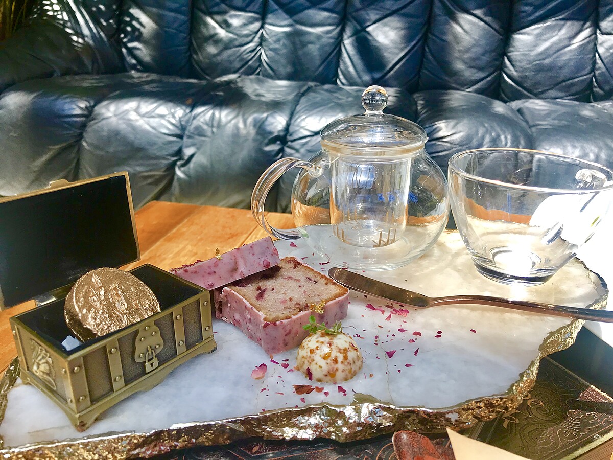 寶盒打開會發現一枚印著城堡的金幣,外觀看似會以為是巧克力,沒想到這枚金幣要放到茶壺裡沖泡,沖泡的過程像整個茶壺像星星般閃爍,金幣裡面居然包著瑪黑茶-藍伯爵茶,喝起來帶有清新果香與溫柔花香,還可喝到紅茶的芬芳,香氣具有層次感。