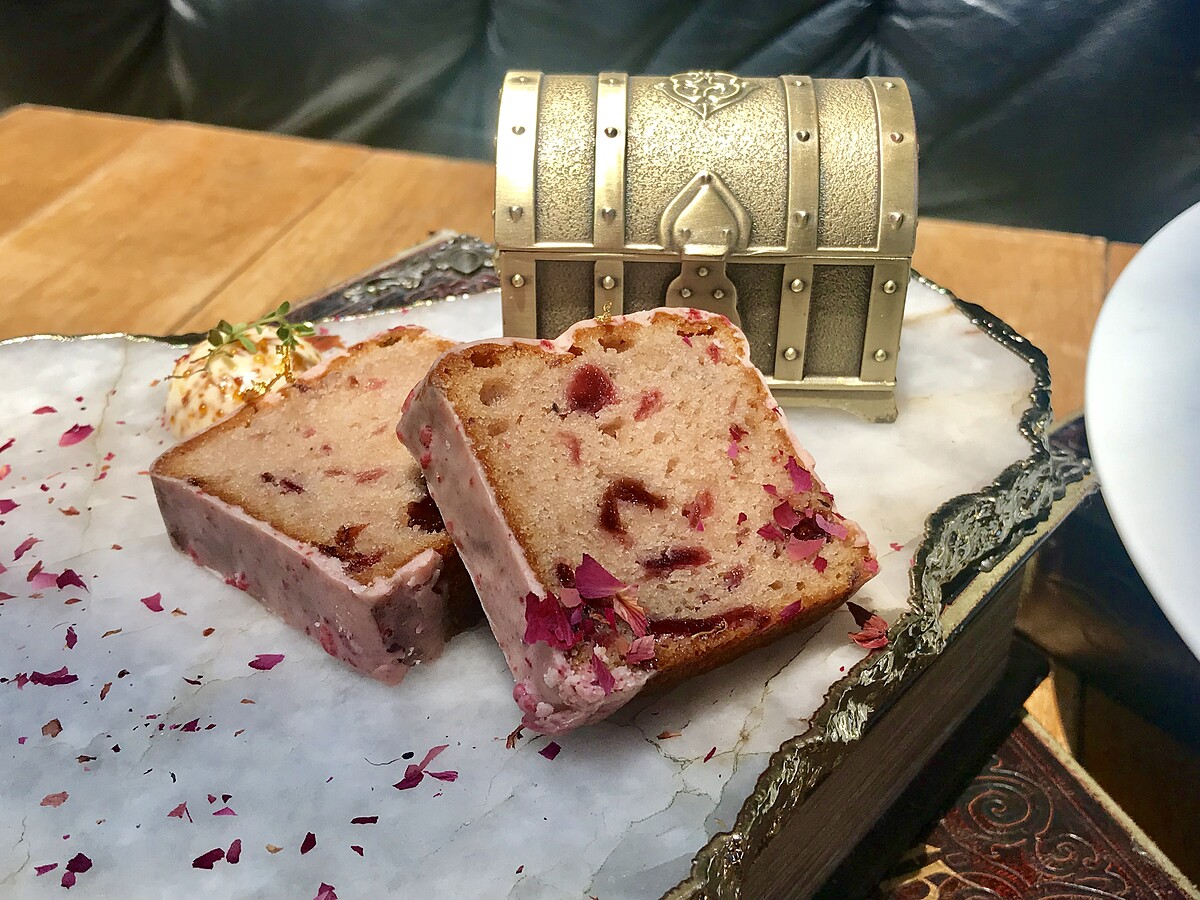 旁邊的洛神花磅蛋糕雖然沒有其他甜點的外型搶眼,但在卻是隱藏的實力選手,扎實的蛋糕體加入洛神果乾、草莓乾,外層搭配草莓巧克力,吃起來從Q到脆的口感,口感豐富特別!