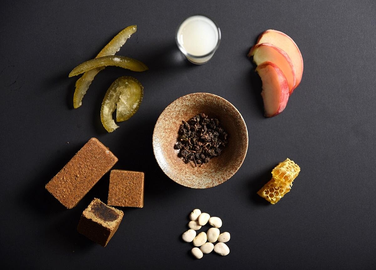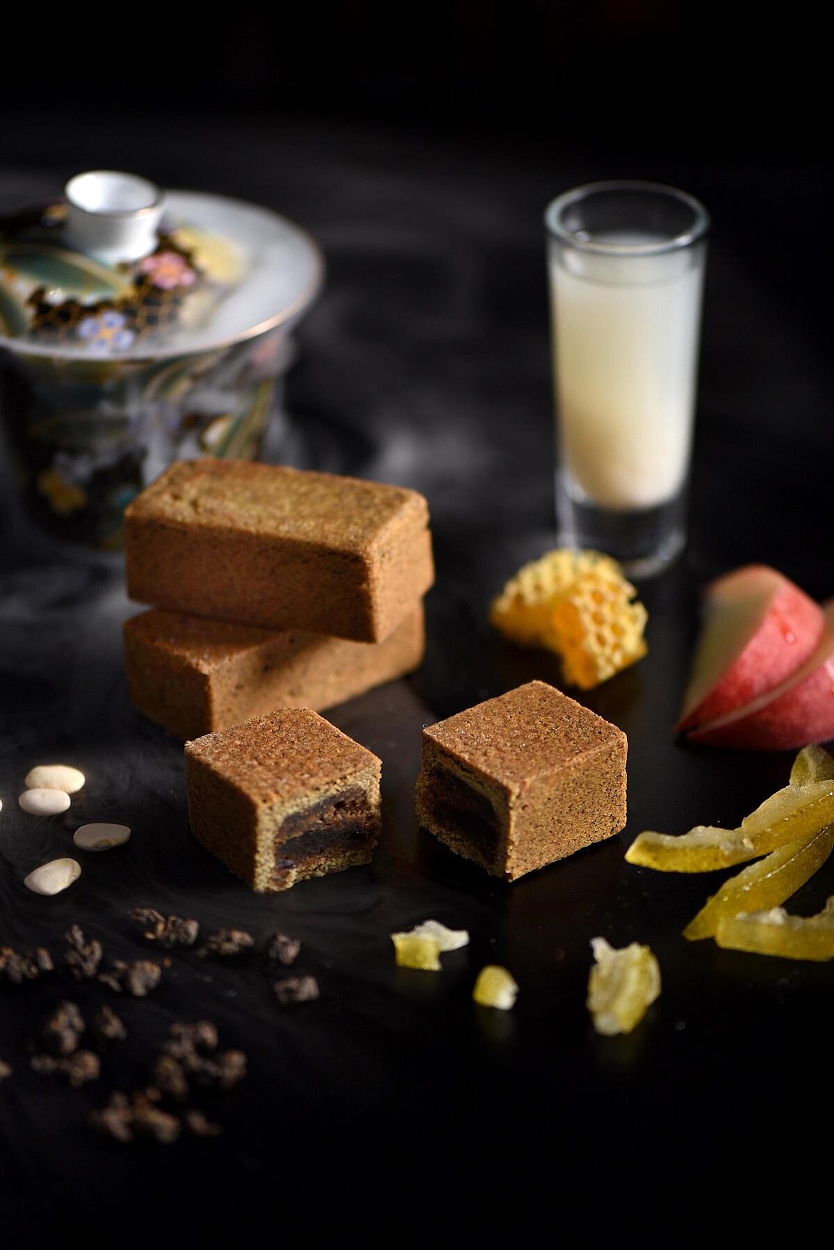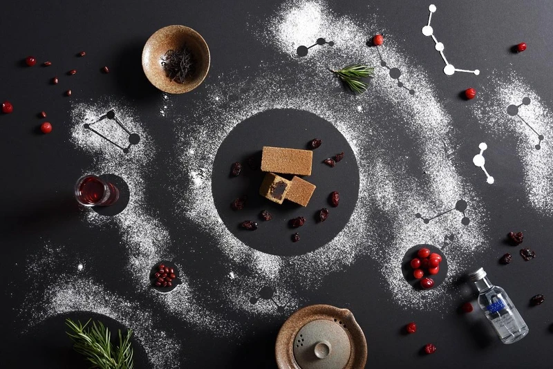 「迷魂香」內餡強調清爽感,將新鮮迷迭香和蔓越莓汁煮沸,融入低糖烏豆沙,再加入伏特加酒與蔓越莓果乾增添口感,迷迭香的特殊草本香氣,讓茶酥香而不膩。另一款「梨山蜜雪兒」內餡則加入白桃果泥、蜂蜜、與柚子原汁,最後拌入琴酒提味,細緻的柚子香氣一如同款茶酒,甜蜜又微醺。
