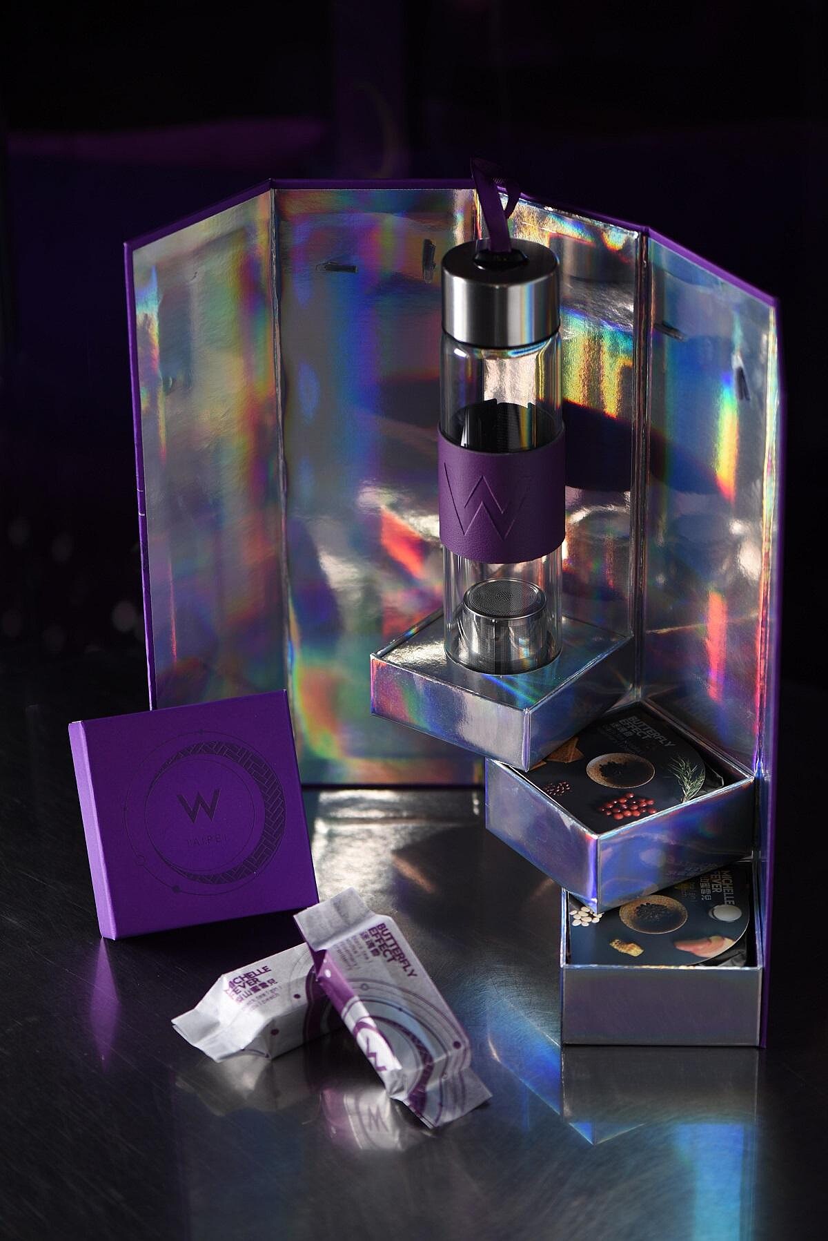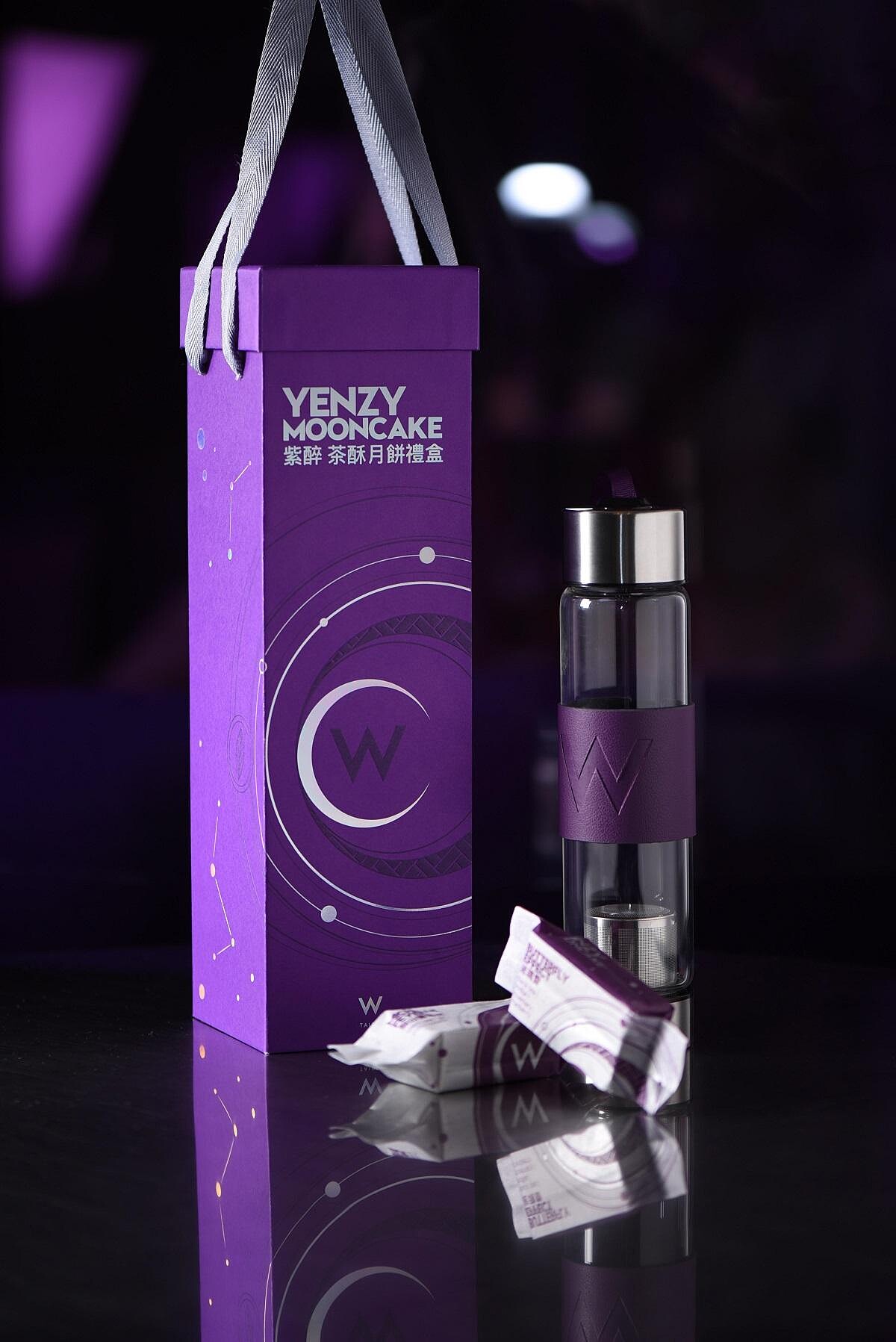 設計師採用無須外袋、一體成形的多層次設計,不但環保同時也可作為收納盒重複利用,禮盒內附贈一只獨家限量「W濾網玻璃冷泡茶壺」,壺內附濾網可直接泡茶,方便隨身攜帶外,時髦的外型更值得收藏。冷泡茶配月餅,是最適合的中秋伴手禮!