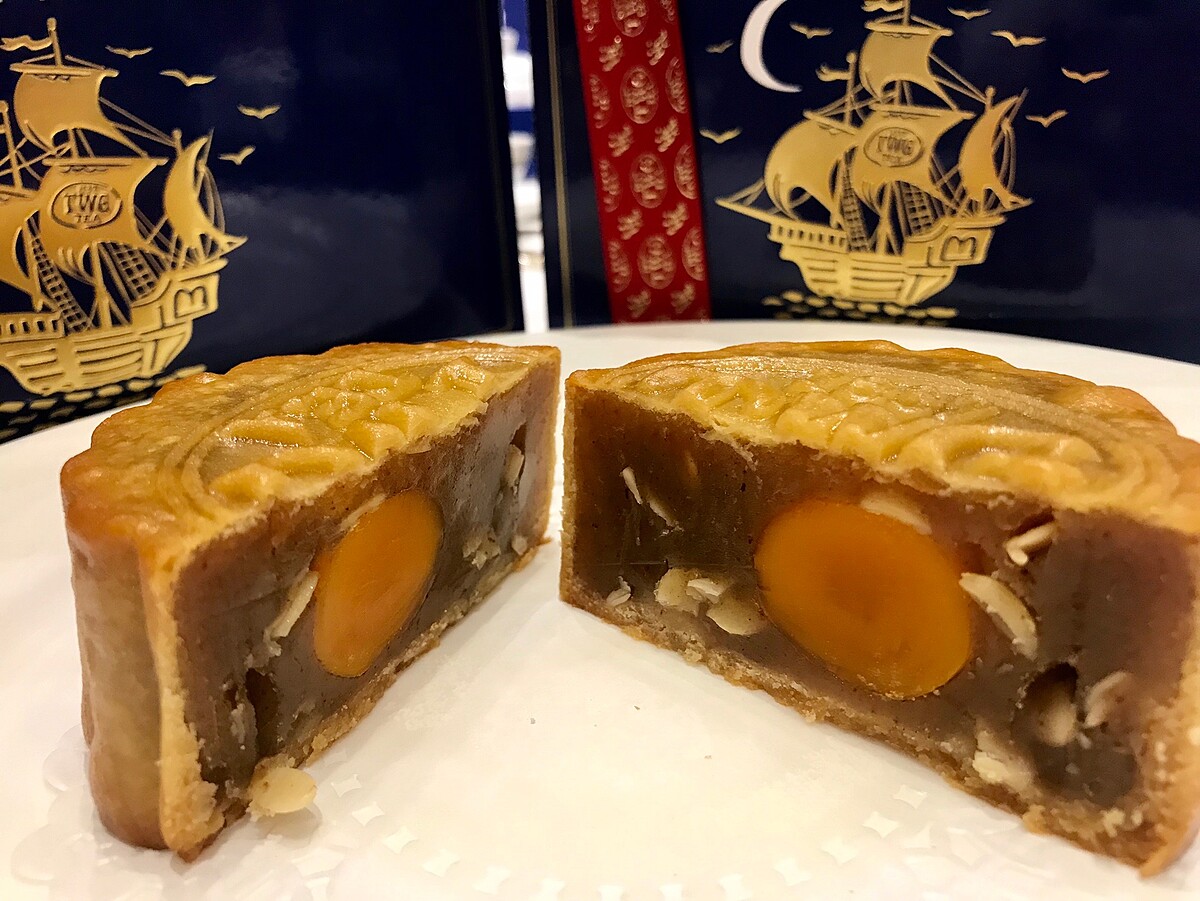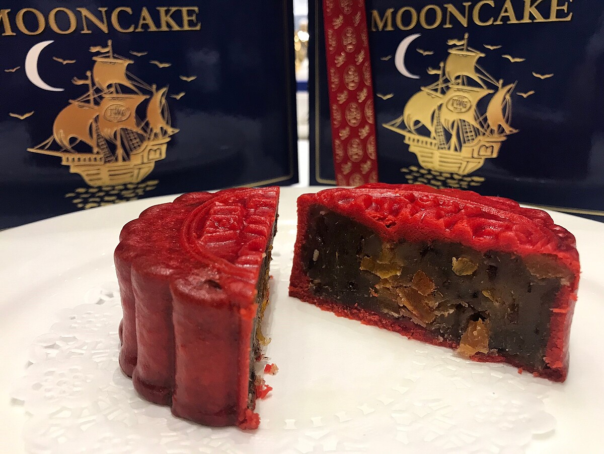 加入白巧克力與椰子顆粒帶有鬆脆的口感,月餅的中心加還夾有酸櫻桃,內餡則是以皇家烏龍茶入味的棕色蓮心。