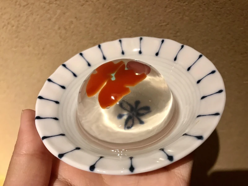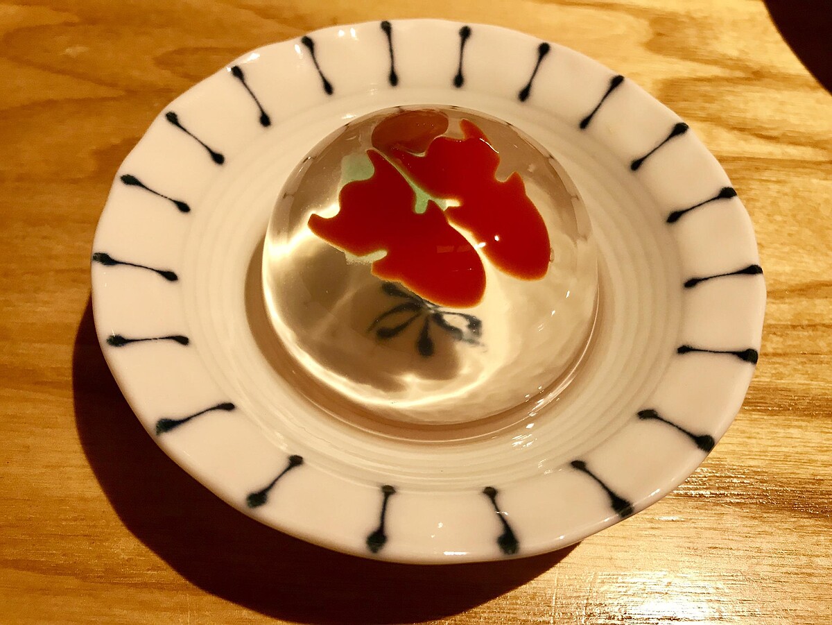 這次與宗家源吉兆庵聯名的「金魚水羊羹」,外表Q彈以外,吃起來帶有葡萄香氣,微酸甜的滋味與口感,在吃完珠寶盒海鮮丼後品嘗這道甜點非常剛好!在日本成雙入對的「金魚」有著「幸福愛戀」的意義!