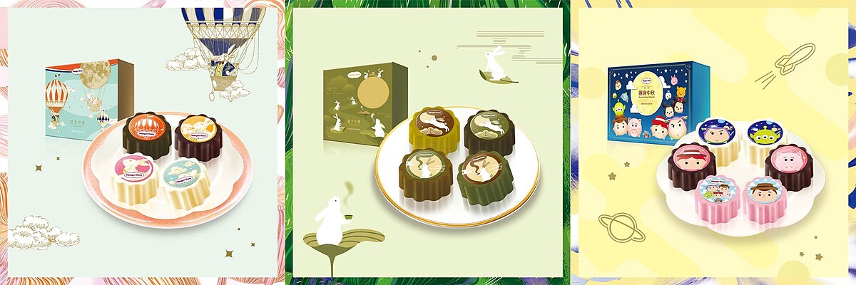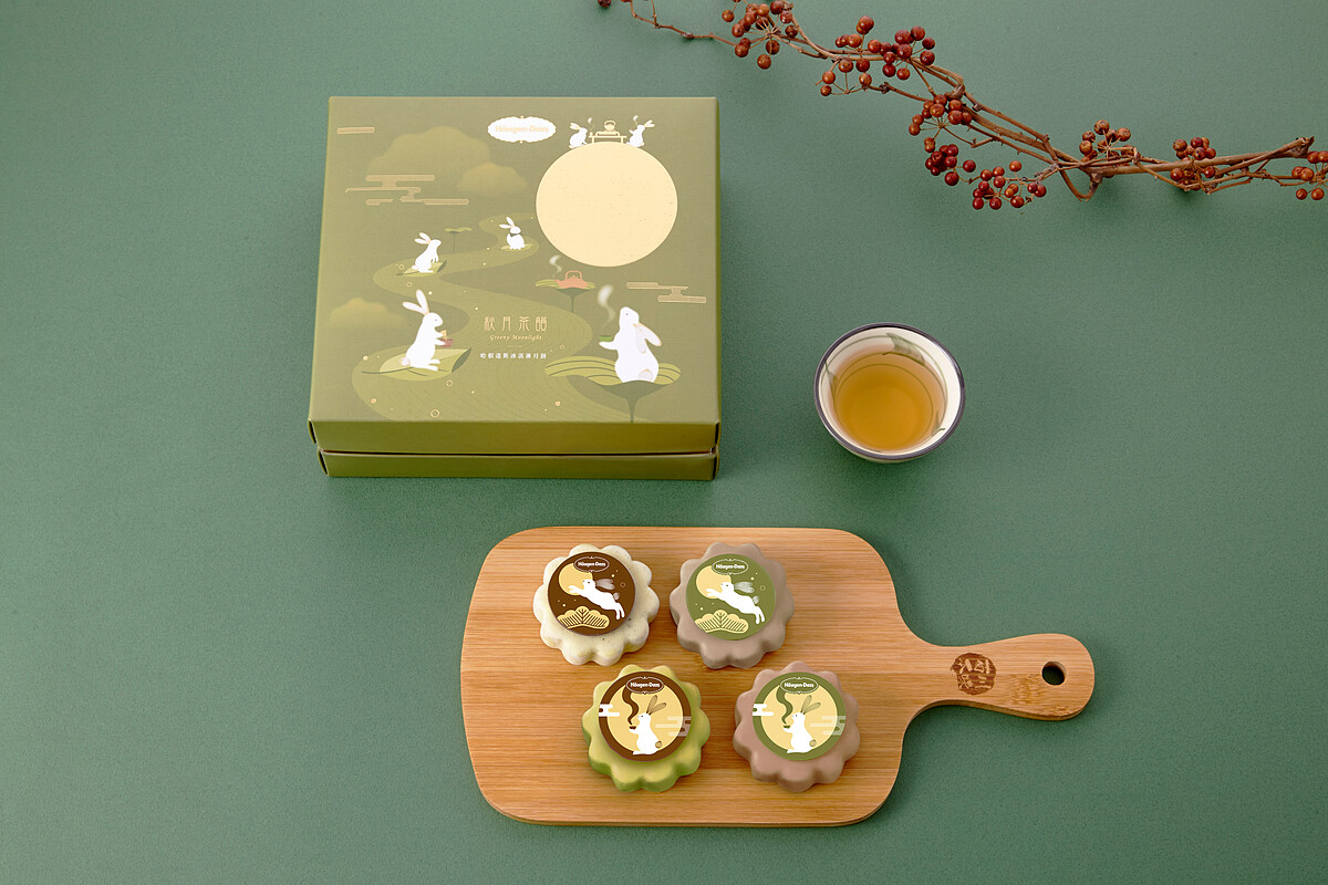 冰淇淋搭配巧克力脆皮口味更是有著日式風情口感的四種創意組合:香草搭配玄米茶巧克力脆皮、巧克力搭配紅茶巧克力脆皮、草莓搭配焙茶巧克力脆皮、橙香柚子搭配抹茶巧克力脆皮,加上擷取月兔形象點綴於月餅上,一口就能清新回甘,吃出秋日幸福的最佳中秋甜點!