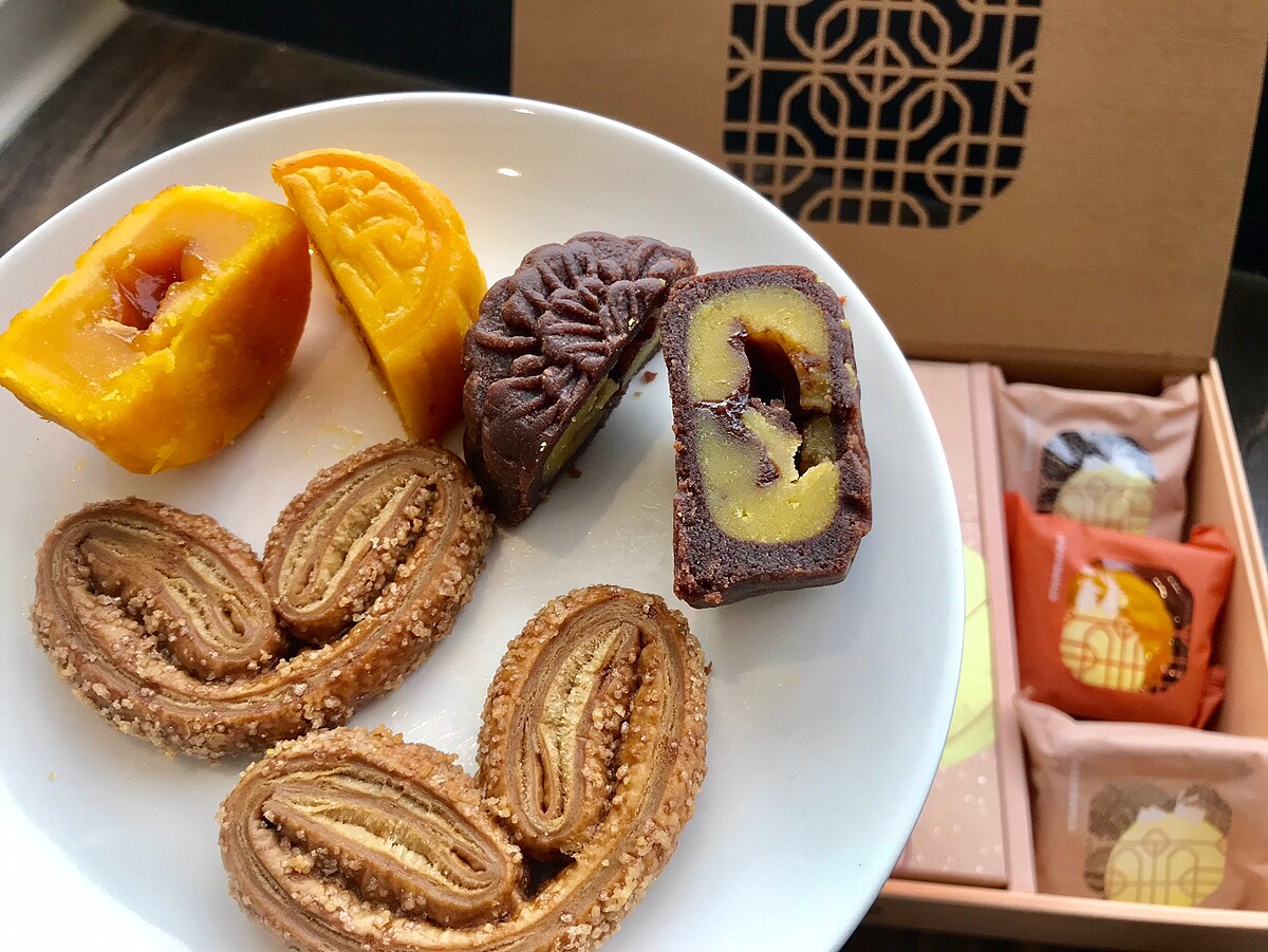 月餅:起司松露奶皇、烏龍可可藏心奶皇、核桃豆沙蛋黃、蓮蓉松仁蛋黃各1顆、蘭姆葡萄夾心餅乾5片