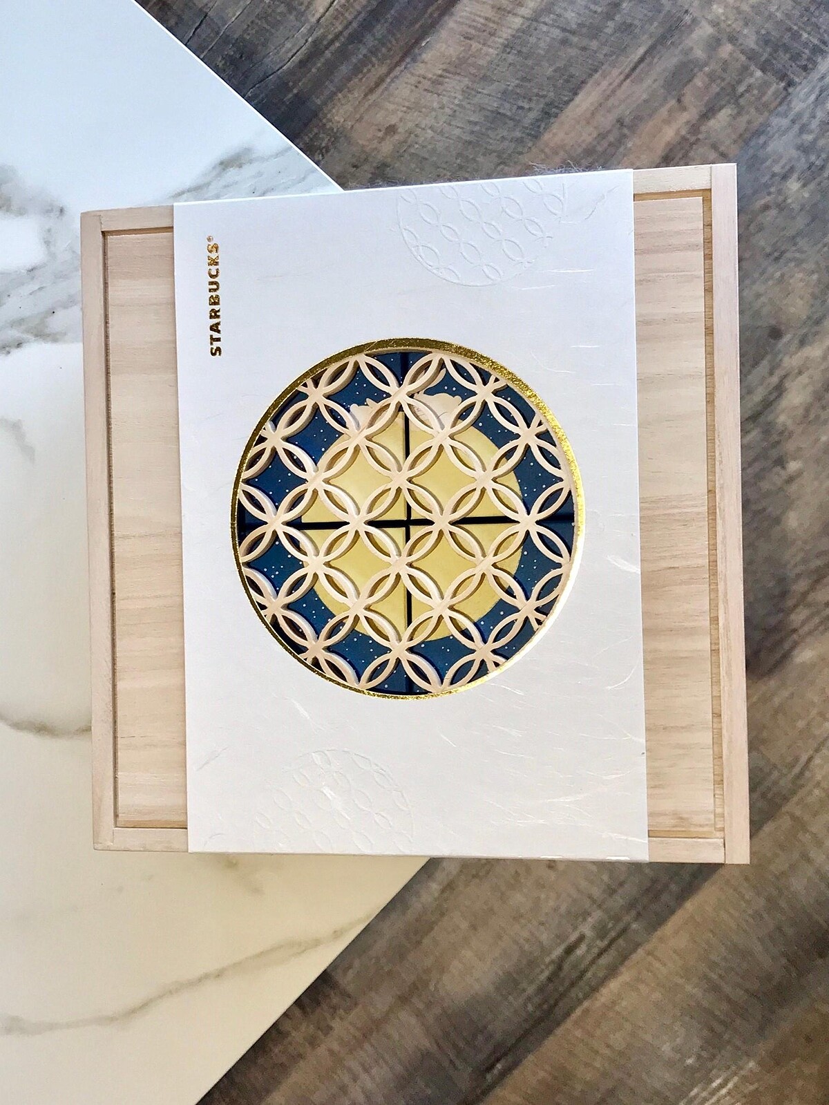 今年最奢華的星巴克禮盒,以奶皇月餅搭配藏心內餡與奢華松露醬,結合了中西創意新口味!外盒以手工打造的木盒,特別請鹿港傳統花窗的老師傅打造木製窗花,非常典雅細緻。外盒食用完畢後拿來收納小物也很適合!