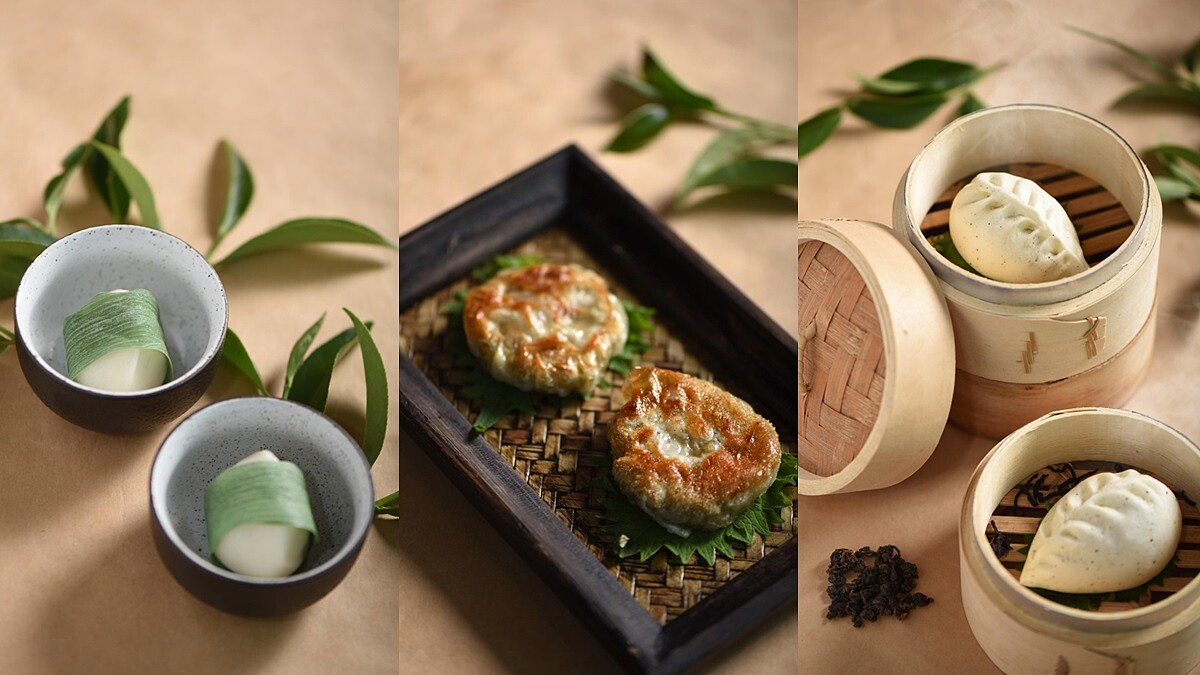 喜歡鹹點的則不能錯過「凍頂烏龍煎蝦餅」、「梨山蜜香野菌素菜包」以及「阿里山高山茶竹葉粿」,都是以茶香為延伸,將台灣茶葉的清雅與濃郁嵌入美食之中。