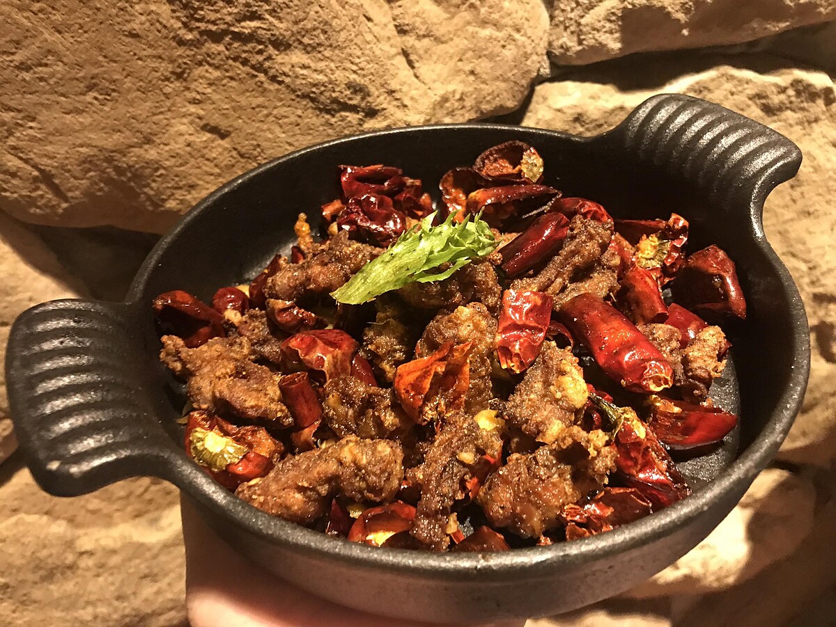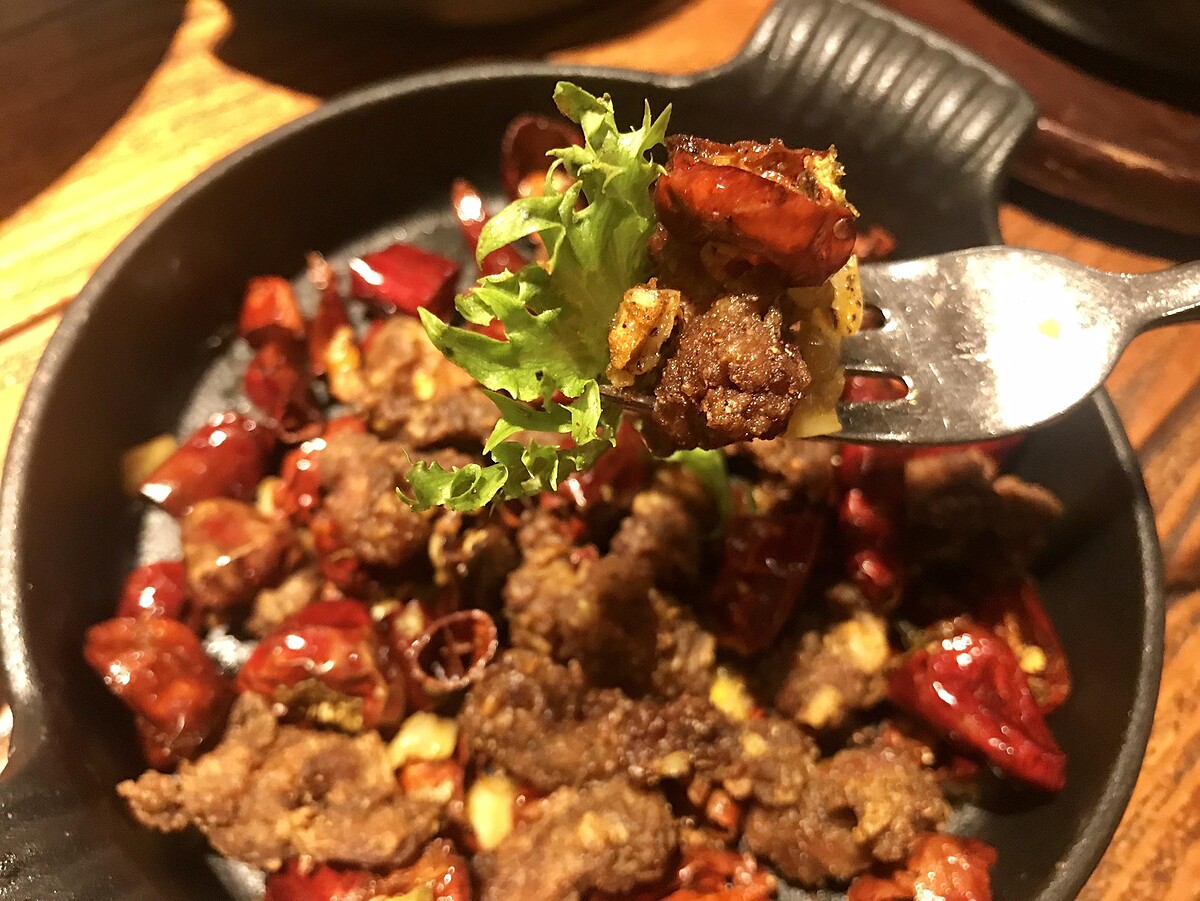 主廚精選特殊部位豬肋條以及雞頸肉,讓人驚喜的豬肉是帶有彈牙脆感口感、雞頸肉的脆口爽感,口感風味層次分明,以四川乾鍋料理呈現香、麻、辣一次滿足!建議搭配裡面的黃色泡椒一同品嚐,剛開始吃會帶點鹹、酸的味道,最後到辣的口感,配上肉一起吃的很適合,這道是小編的私心推薦~
