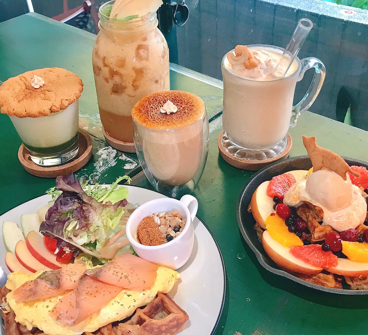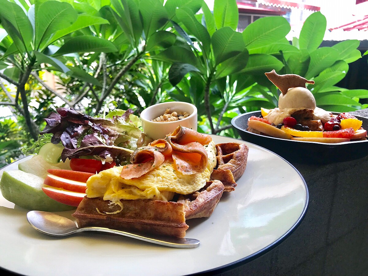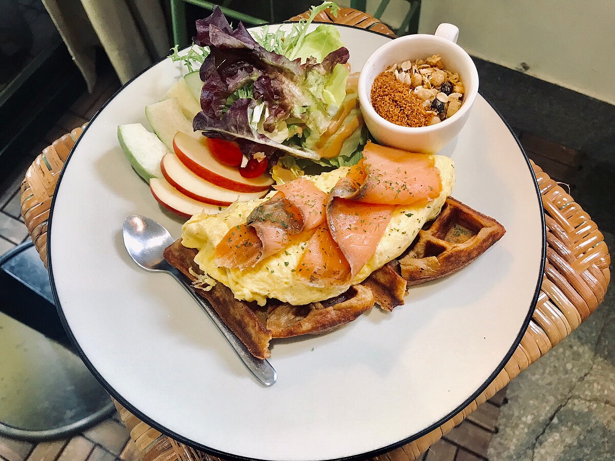 新鮮鮭魚搭配軟嫩的歐姆蛋,鬆餅加入有機棕櫚糖品嚐起來帶有自然甘甜味,還有季節水果、燕麥優格杯,吃起來清爽無負擔,正在減肥中的人也能好好吃一餐!