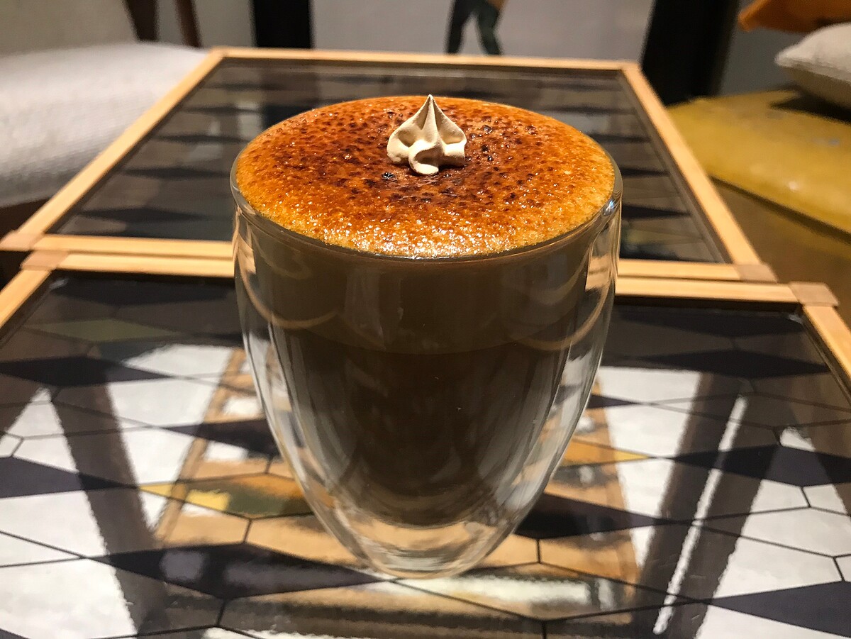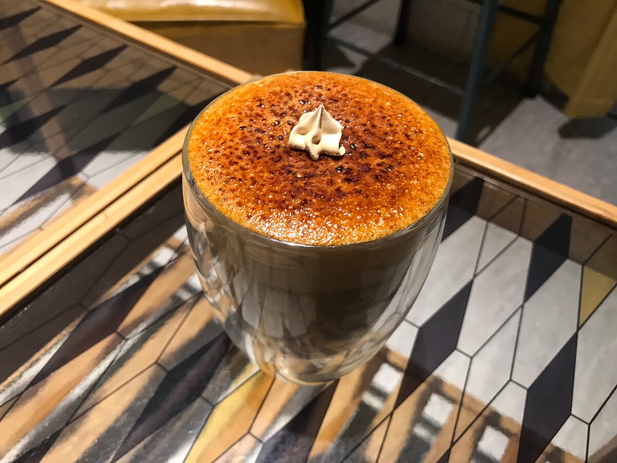 在拿鐵最上層撒上棕櫚糖烤過,表層帶有焦香味的脆感,更增添了拿鐵的風味!