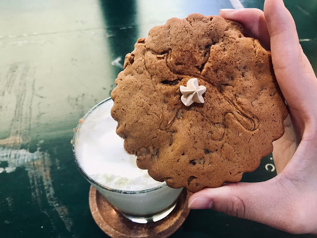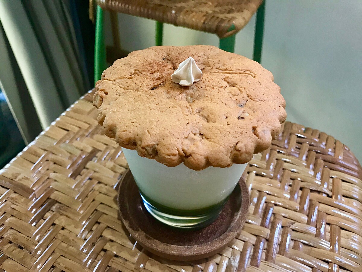 最讓人驚喜的是最上方有一個餅乾杯蓋,手工餅乾也是加入棕櫚糖製作而成,上面還印著貓面的圖案,吃起來淡淡的甜味。喝起來帶有濃郁的抹茶香氣搭配牛奶,超幸福~