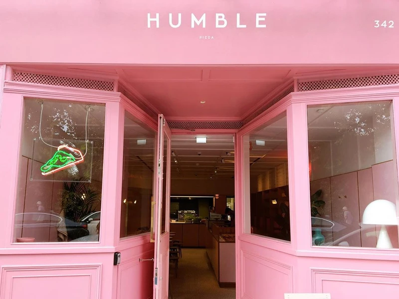 「Humble Pizza」裝潢風格以粉色調為主,整間店面充滿粉色,細節中妝點綠意更加時髦,外觀會以為是甜點店、咖啡廳,但讓人驚訝的是居然是Pizza店!