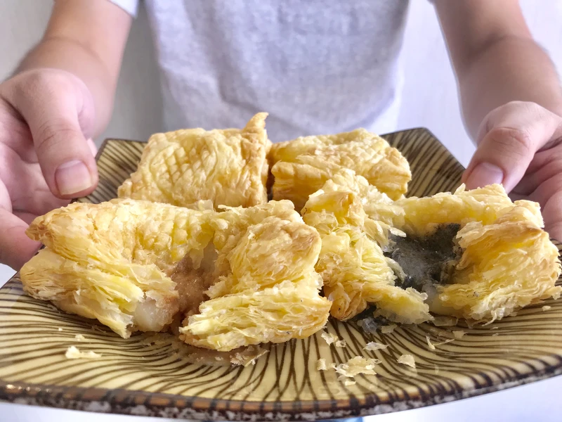 溫馨提醒酥皮從冷凍庫中先拿出來約30秒退冰,確認不會太硬斷裂即可!