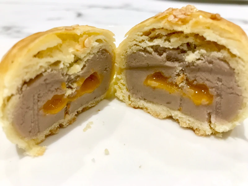 外觀看起來是非常傳統的月餅,但絕對是實力派的月餅選手,切開後裡面有一顆超大的蛋黃,與烏豆沙餡蛋黃完美搭配!愛吃蛋黃的人不能錯過這款~