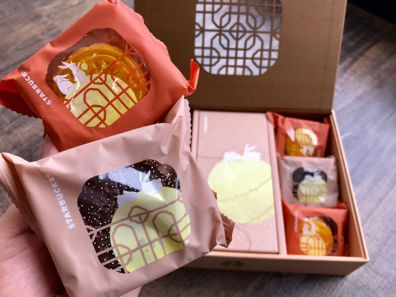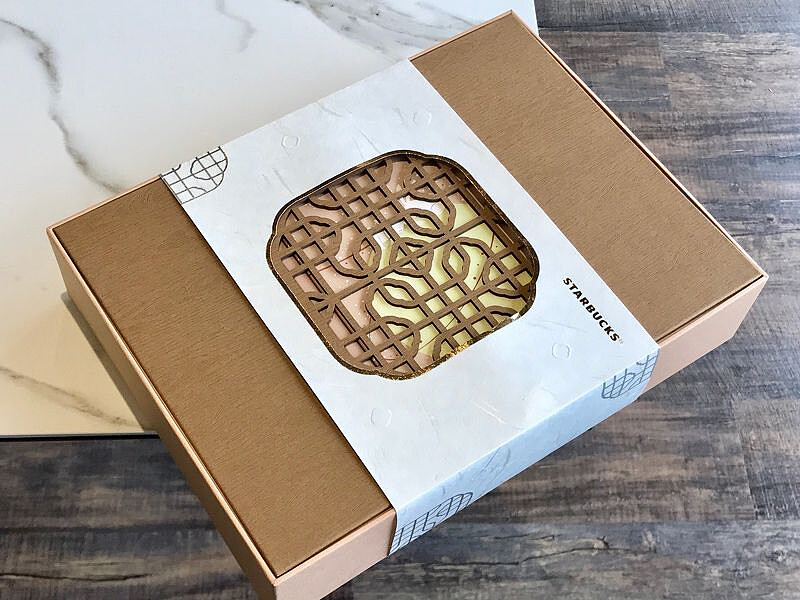 今年最奢華的星巴克禮盒,以奶皇月餅搭配藏心內餡與奢華松露醬,結合了中西創意新口味!外盒以手工打造的木盒,特別請鹿港傳統花窗的老師傅打造木製窗花,非常典雅細緻。外盒食用完畢後拿來收納小物也很適合!