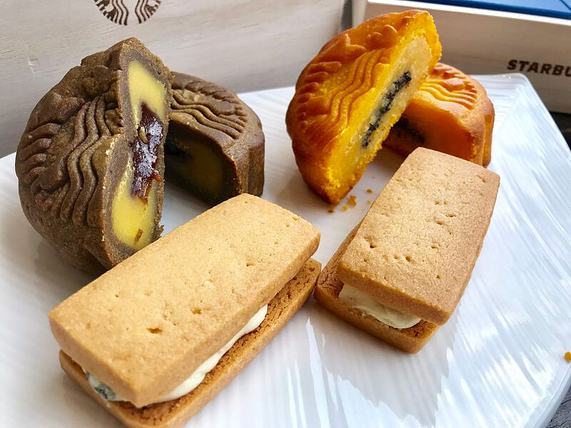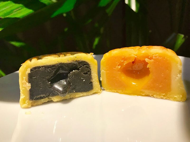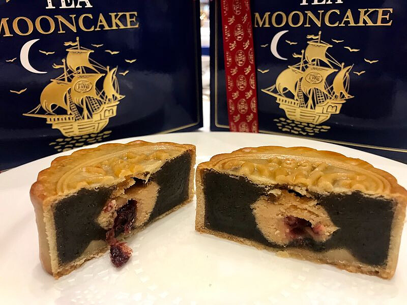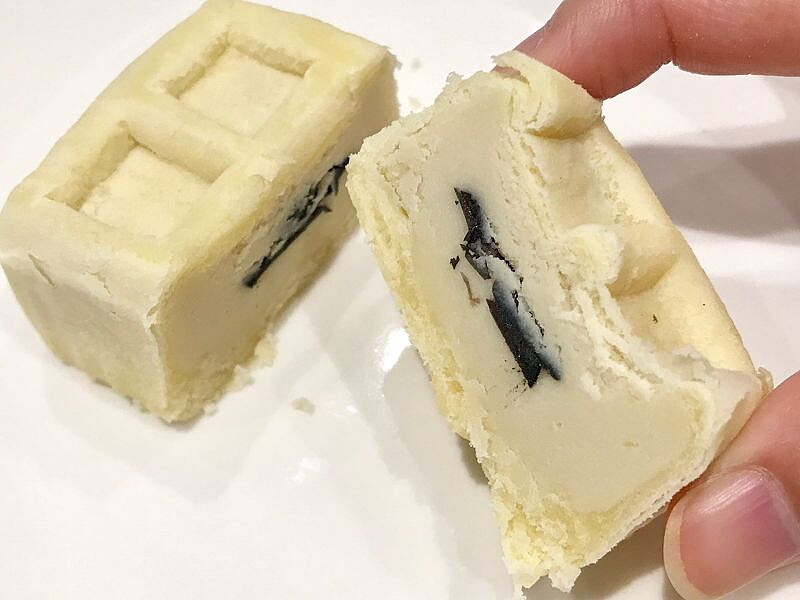 加入白巧克力與椰子顆粒帶有鬆脆的口感,月餅的中心加還夾有酸櫻桃,內餡則是以皇家烏龍茶入味的棕色蓮心。