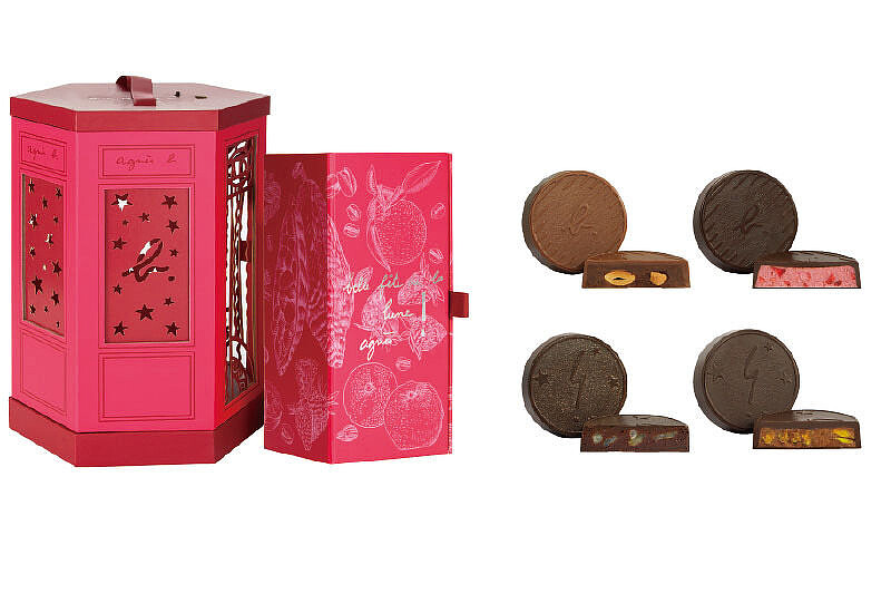 水果巧克力系列添加鮮甜莓果乾增添口感,還有充滿中秋節氛圍的清新柚子與黑巧克力結合,甜度非常剛好。月餅設計別具巧思,簡約的線條加上agnès b.手寫Logo及經典反諷點圖案,更顯趣味及品牌特色。