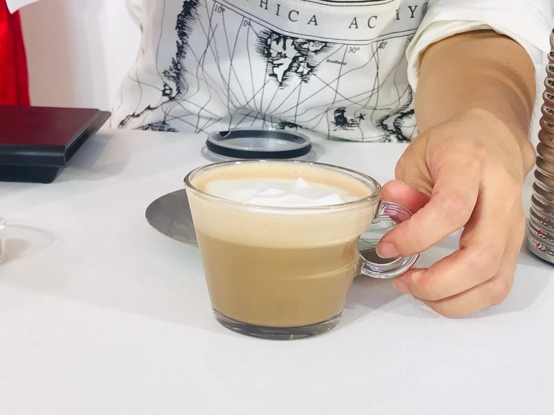 5. 將製作完成的「Mocha」注入View Cappuccino玻璃杯中,在Mocha上方鋪上熱奶泡至9分滿