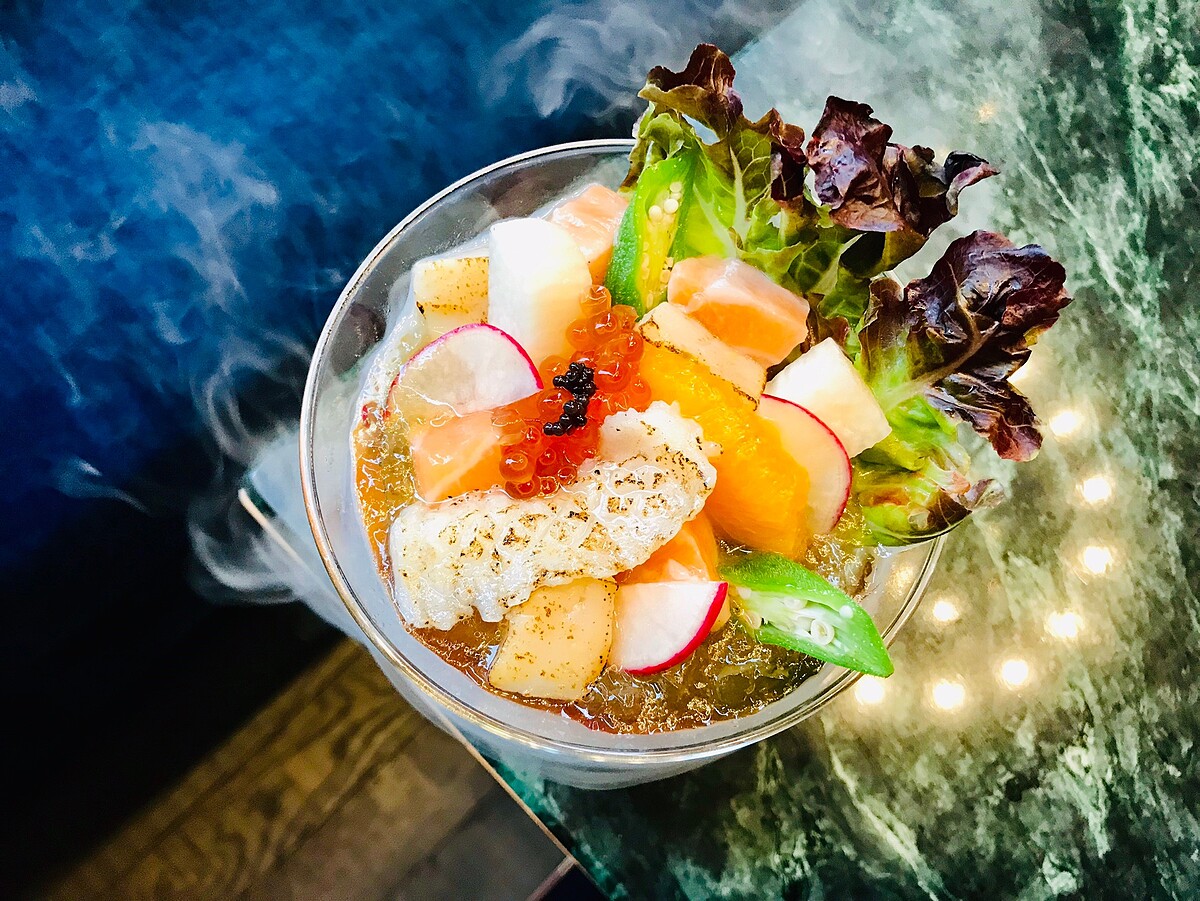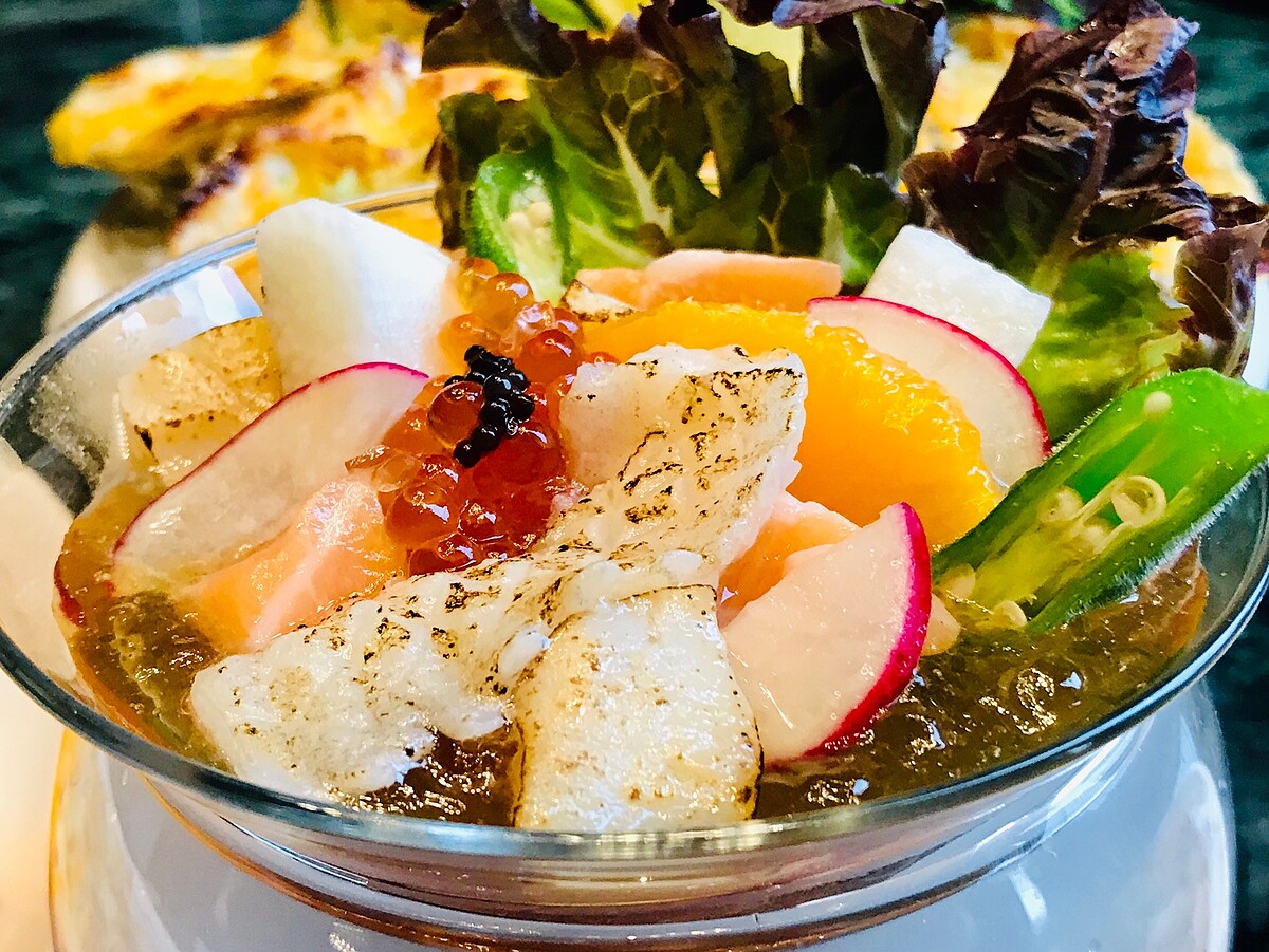 炎炎夏日胃口不佳,五彩繽紛的「美人魚的寶座」清爽程度讓人胃口大開!使用炙燒比目魚鰭邊肉、鮭魚搭配主廚精選魚子醬、鮭魚卵、柑橘果肉等,視覺就超級夢幻豐富,最底下是特製的白醋凍淋上蜂蜜,微酸微甜的滋味是開胃菜的首選!
