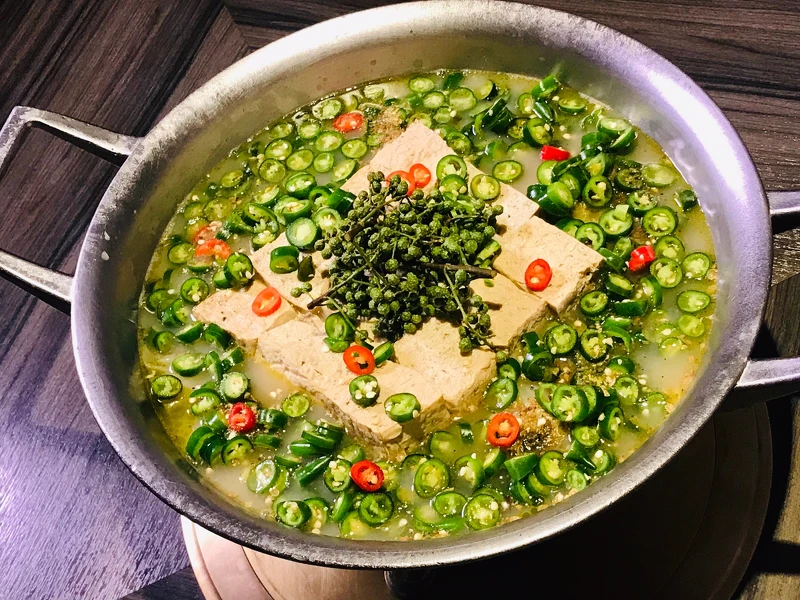 鍋底則以新鮮青辣椒、大白菜與凍豆腐煨煮3小時才能上桌,整個火鍋散發陣陣清香,可以直接品嘗麻辣鍋的湯底!