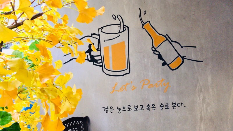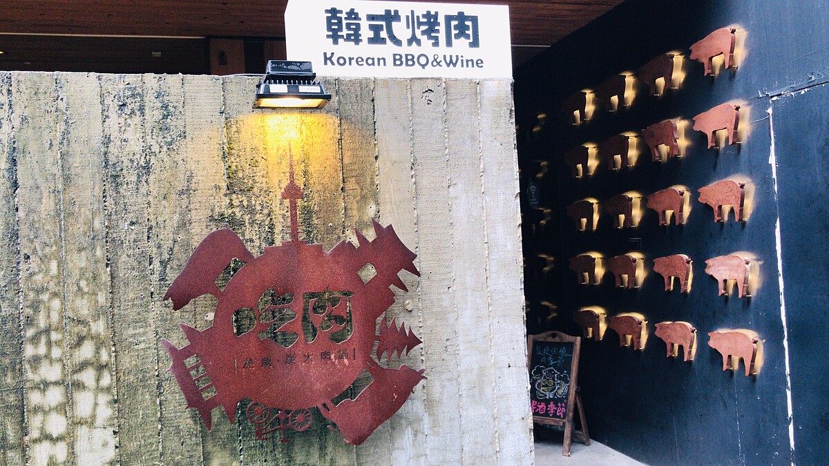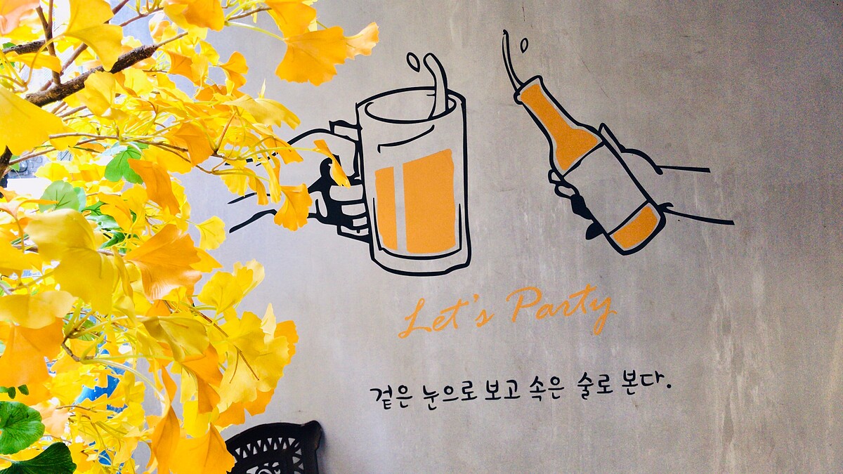 外牆有一面韓系手繪牆面搭配著銀杏的韓文寫著:「雙眼只能看見人的表面;真實內心透過酒來揭曉吧!」超適合無肉無酒不歡的韓式燒肉!
