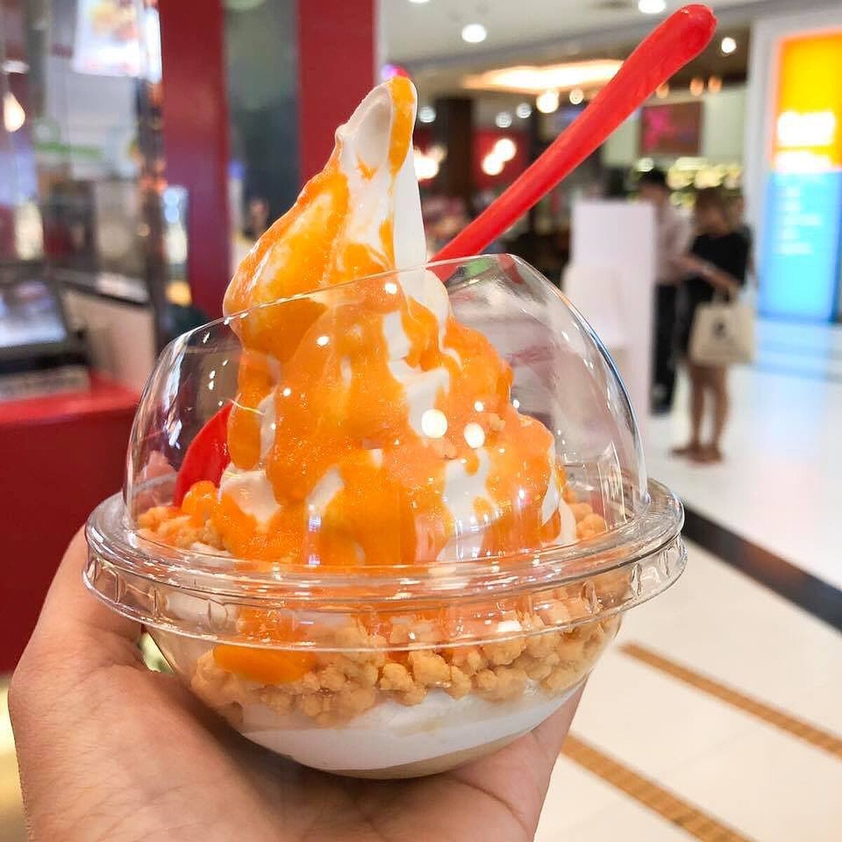 最底下鋪滿了鹹蛋黃餅乾,再放上經典的霜淇淋、淋上鹹蛋黃醬,好想吃一口!