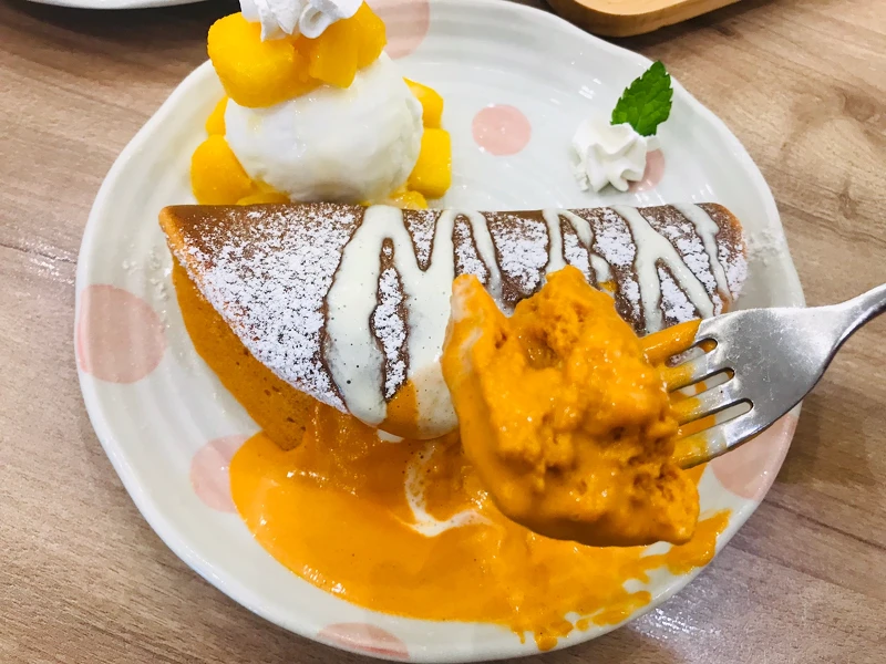 將泰式奶茶與「雲の鬆餅」結合,茶香十分濃郁但卻保有奶香氣息,使用特調比例再加入椰香冰淇淋、芒果的組合,最後淋上泰奶香草醬,一口吃下超綿密的口感搭配茶香擴散在口中,吃的不是鬆餅是幸福!