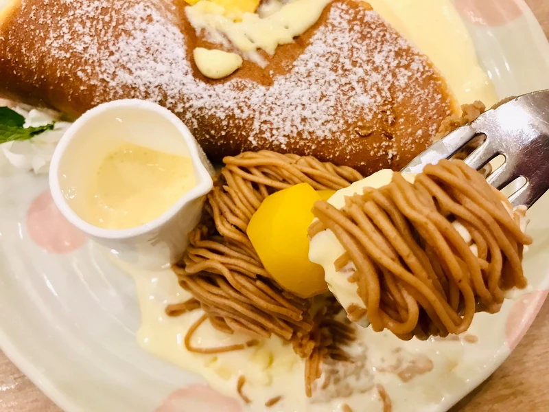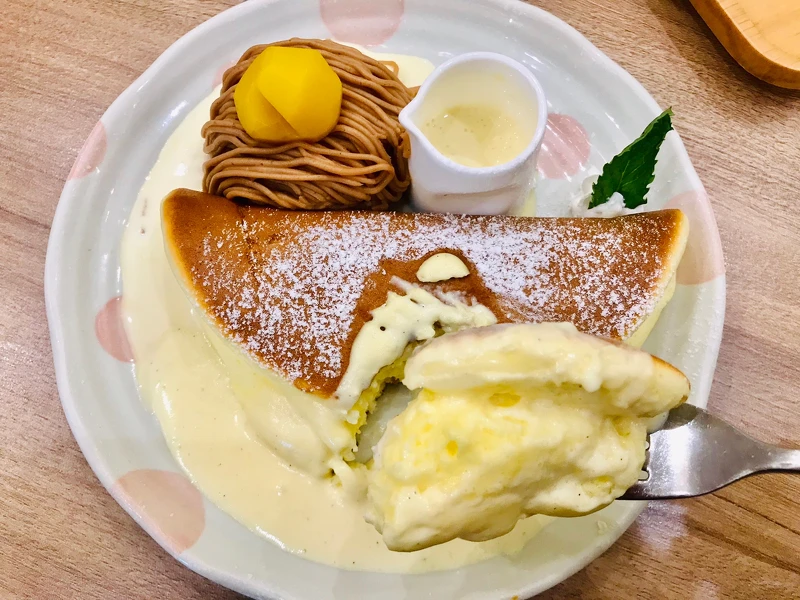 這款不是這次的期間限定,但也是帶有秋天氣息的蒙布朗,搭配超Q彈的雲朵鬆餅,再加上蒙布朗冰淇淋,一口吃下超療癒~
