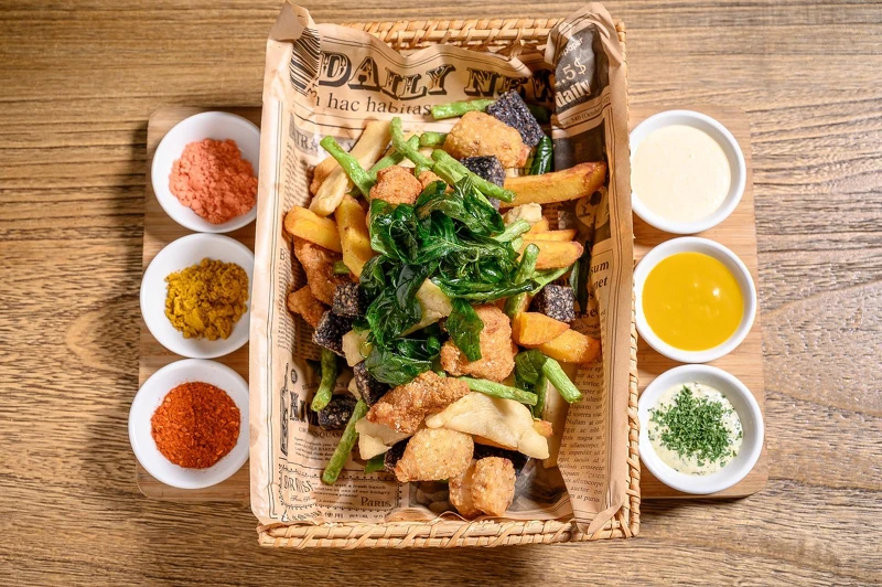 把經典台灣小吃鹹酥雞搬上餐桌,多重炸物搭配中西合併的六種特選醬料,除能搭配啤酒之外,伺酒師建議冰白酒更是提升口感層次的優雅選擇。