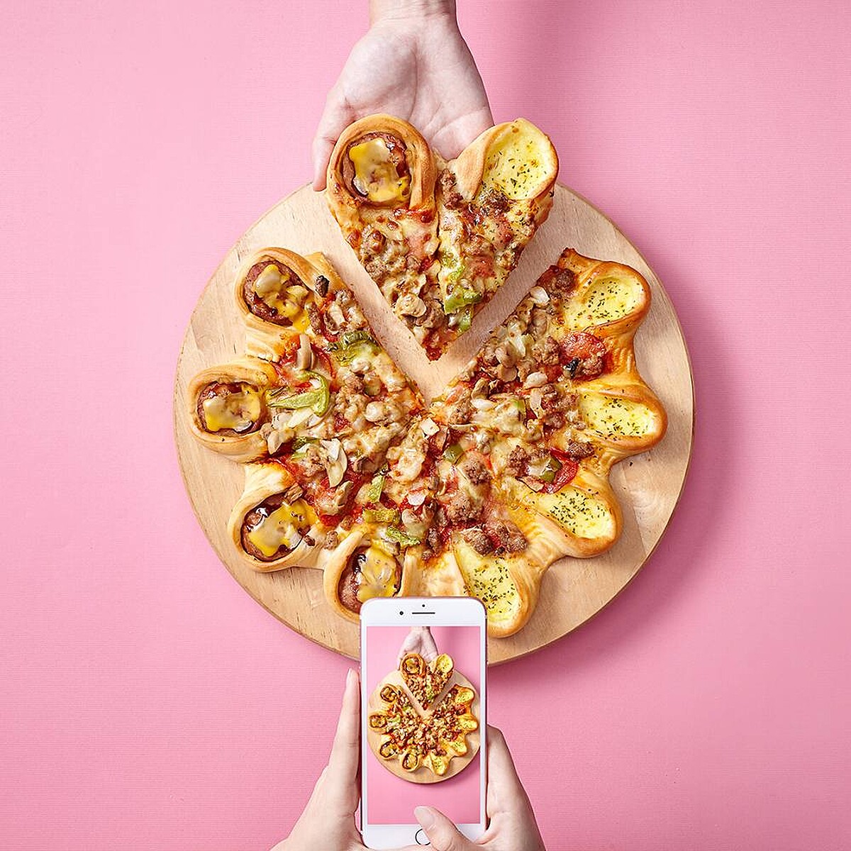 最近開箱文大火,美妝品和手機開箱文都不稀奇,妳有看過「Pizza開箱文」嗎?連Pizza都可以拍開箱,正是因為必勝客推出最新「心花漾起司漢堡餅皮」,一開盒就可以看到衝擊視覺的豐富餡料與特殊造型。一整片組合起來是可愛的一大朵Pizza花,局部取連接兩片合起來,原來是浪漫愛心型(害我眼冒愛心惹~),好拿取又好入口(點評:口感絕讚)。完全適合近拍特寫、外加上下左右各來一張,拿久爽拍也不手痠、拍夠了就給它一大口啃了,所以推出才一個月就已吸引好多愛嘗鮮的貪吃狂魔上門!