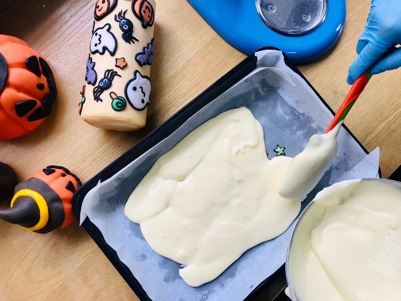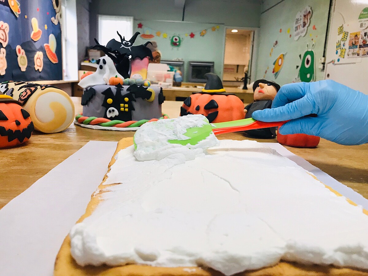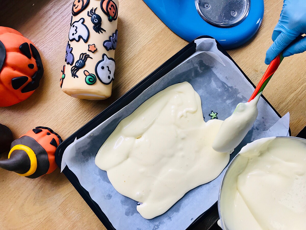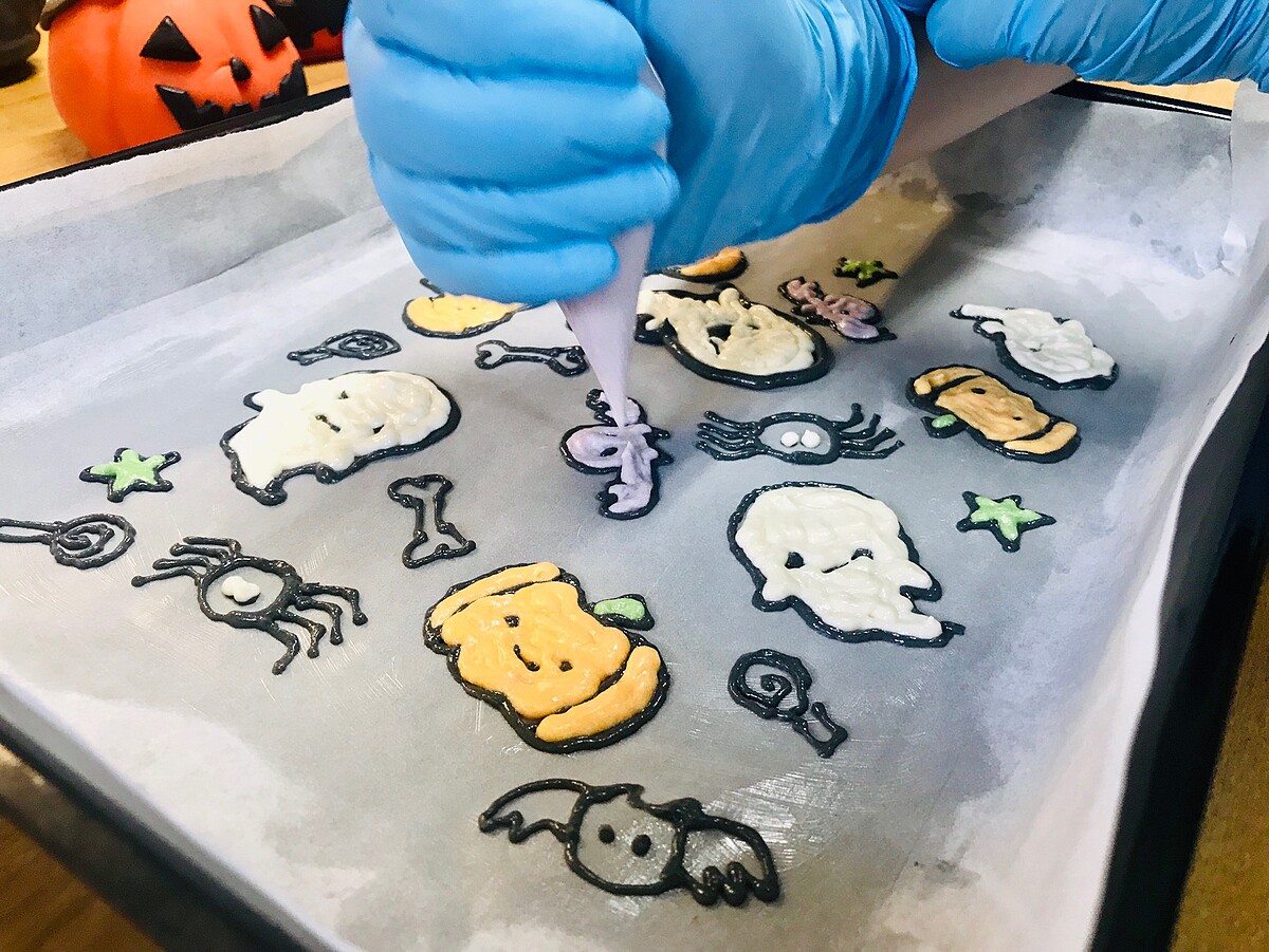 剛開始先塗上奶油,再描上各種萬聖節圖案代表精靈、蝙蝠、蜘蛛……等等,再填入繽紛色彩!為了讓圖案凝固會放入冷藏~