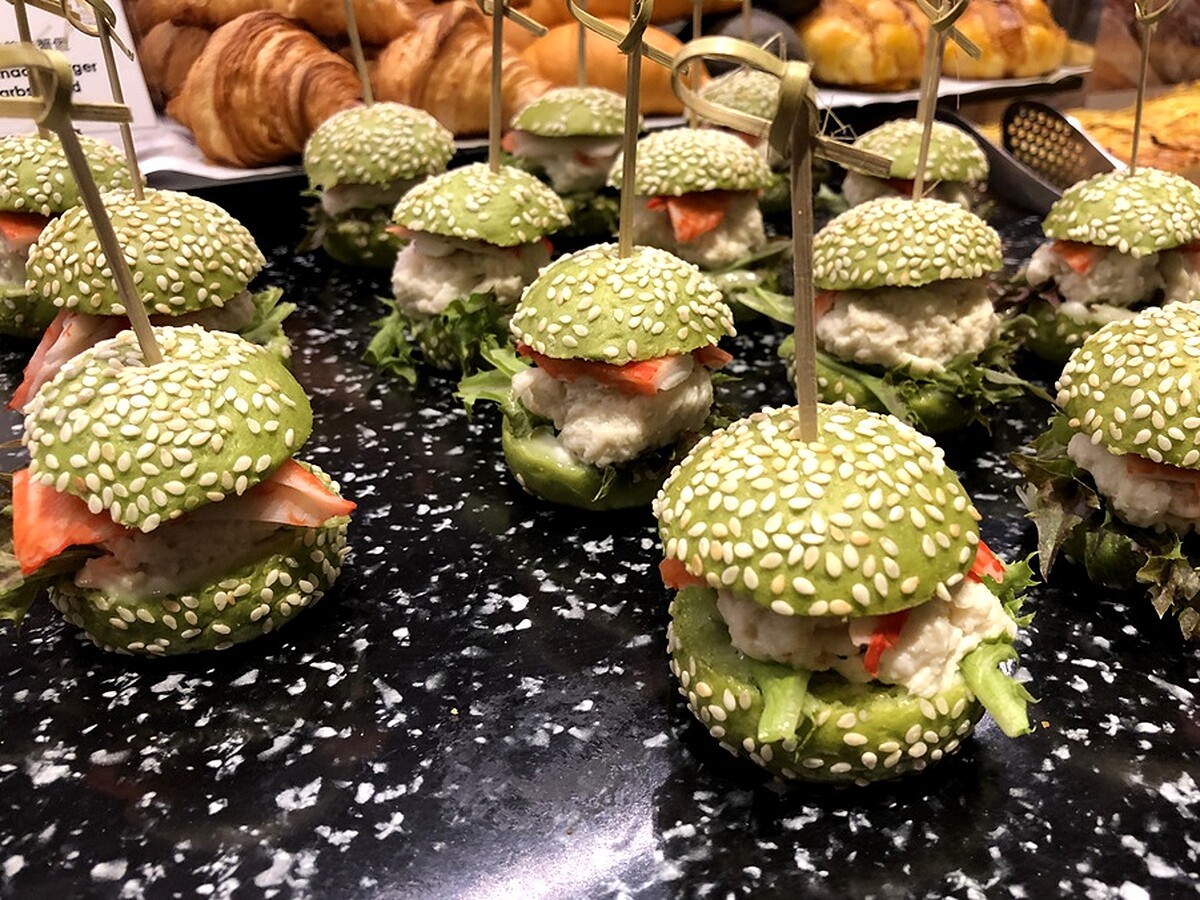 甜點更具巧思!「鹹蛋黃蟹肉馬卡龍」將馬卡龍外殼混入切達起司,配上奶油白醬蟹絲鹹蛋黃內餡,創造出鹹甜風味馬卡龍;還有將新鮮菠菜融入漢堡皮,打造直接4公分的「菠菜風味美味蟹堡」,視覺、味覺都驚豔!假日還會再加碼推出無限享用「帝王蟹腳」,每位售價午餐1180元+10%、晚餐1680元+10%。