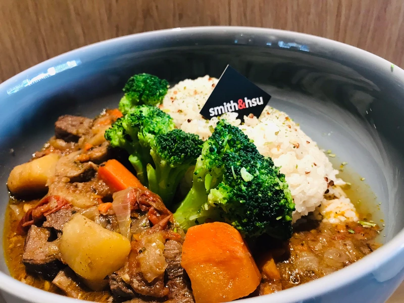 品嘗起來馬鈴薯鬆軟綿密,牛肉跟紅蘿蔔搭配得恰到好處,月桂葉的香氣更增添了層次感,紅酒提升了牛肉鮮甜感。香氣足且鮮甜的醬汁搭配藜麥飯,讓人一口接一口無法停下來的美味!