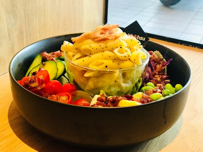 使用少油少鹽少烹調的烹調方式,非常適合喜歡清爽料理或是正在健身減中的人享用!以義大利筆管麵與香烤培根為主食,佐以含擁有好蛋白質的水煮雞蛋,搭配大量的新鮮蔬果,像是黃甜椒,紫高麗菜,綠毛豆,雞蛋,紅番茄以及翠綠小黃瓜等等豐盛的蔬果!