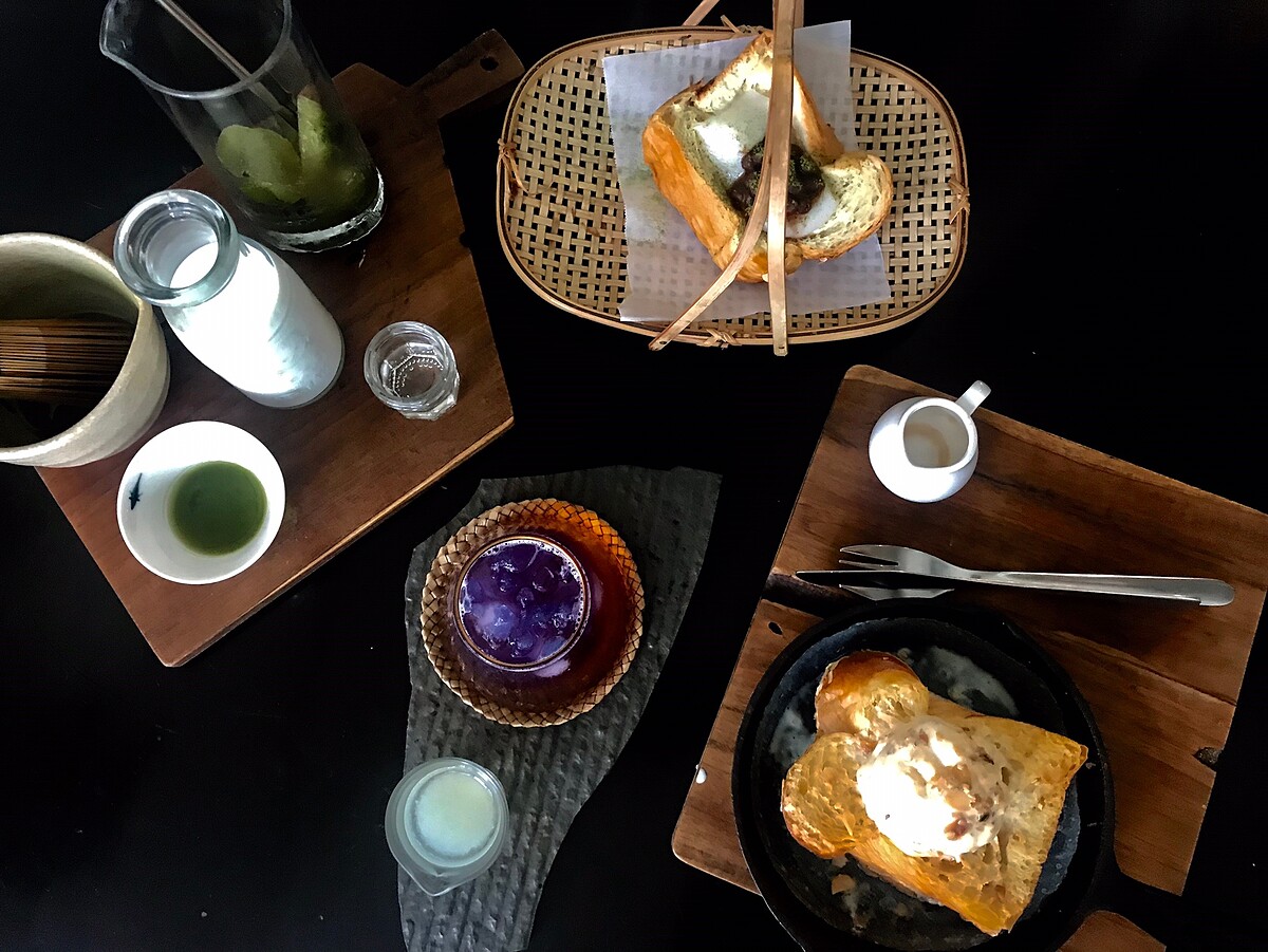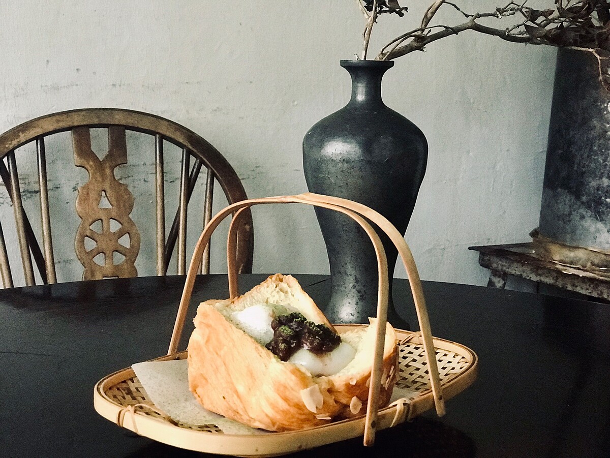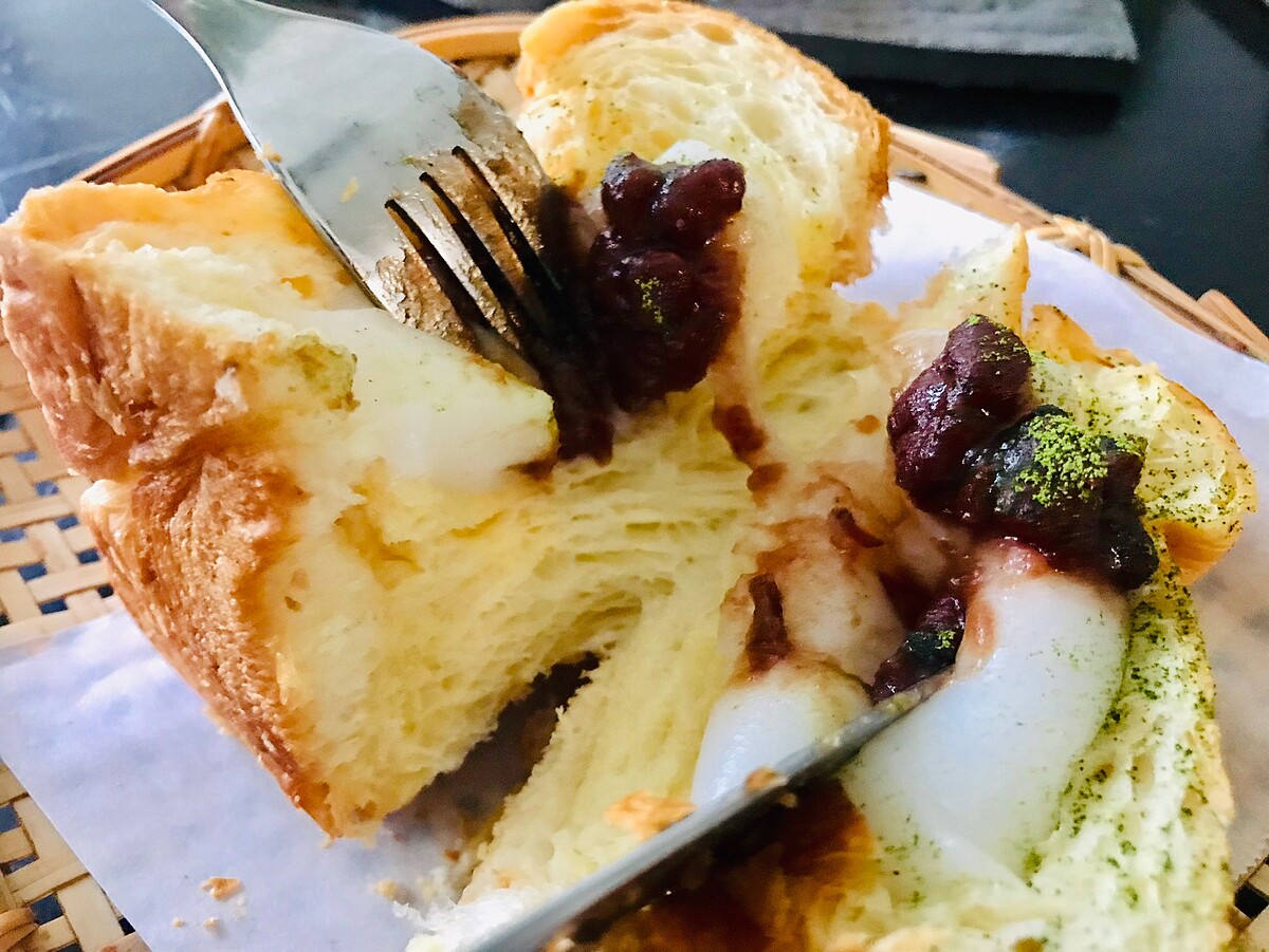 以竹簍的方式呈現更讓人感到復古懷舊,使用超厚的丹麥吐司,最上方放上麻糬、北海道十勝紅豆再放入烤箱烘烤,最後在灑上抹茶粉!