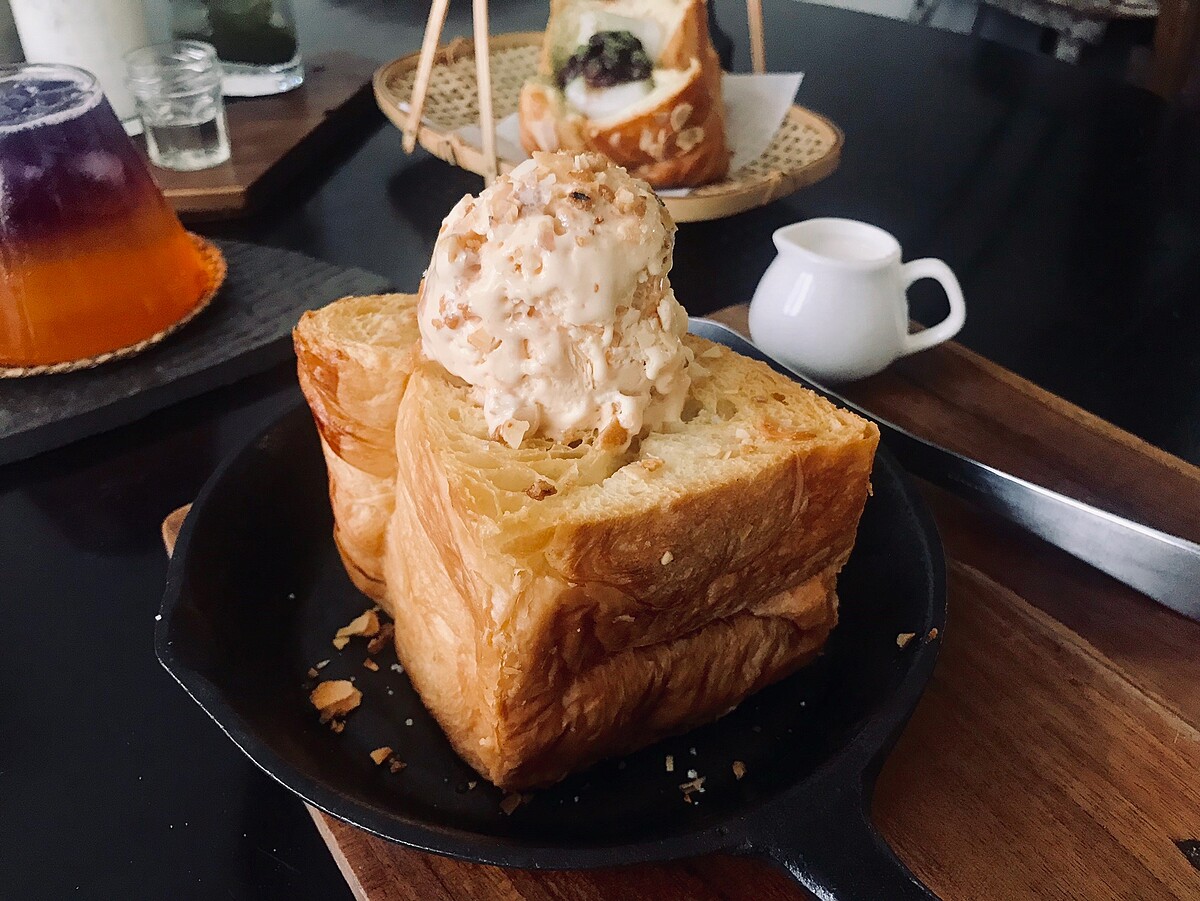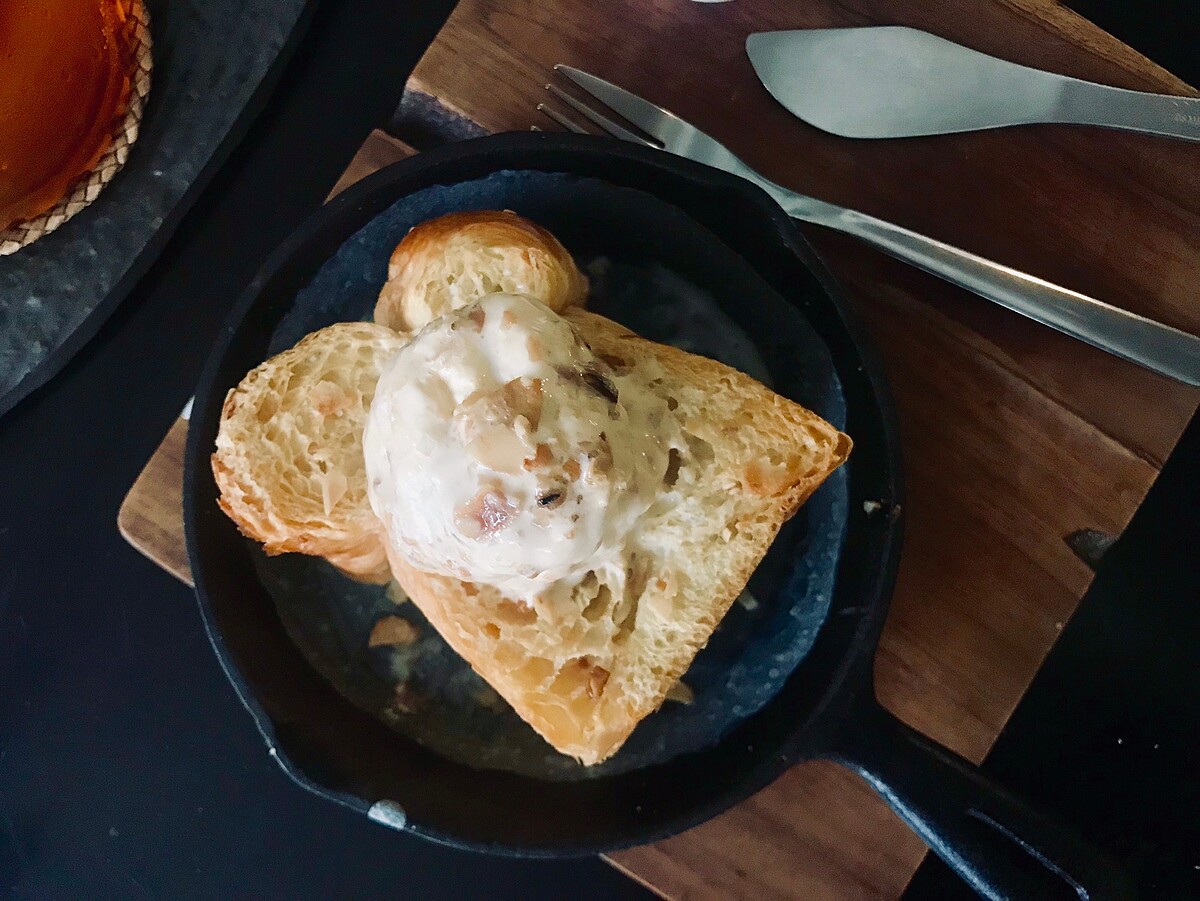 在丹麥吐司上放上店內手工的冰淇淋,店家自行炒的焦糖脆片製成的冰淇淋,再淋上貝里詩奶酒與鮮奶,品嘗起來帶有淡淡酒香,搭配丹麥麵包超級適合!