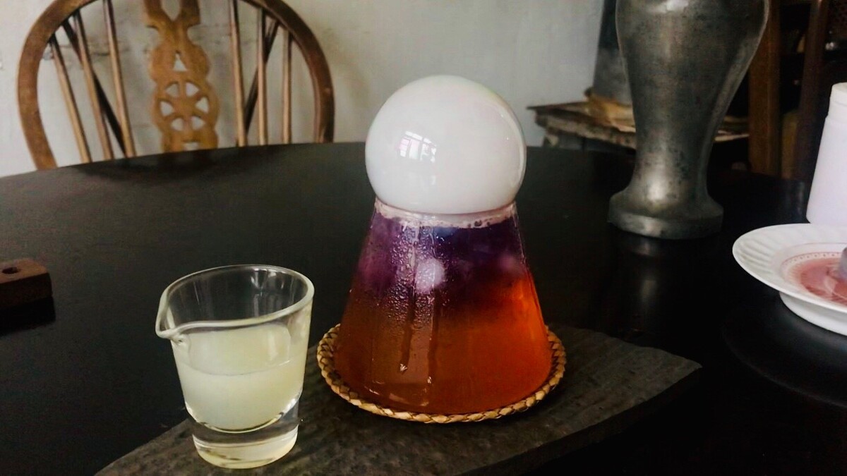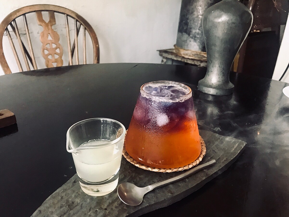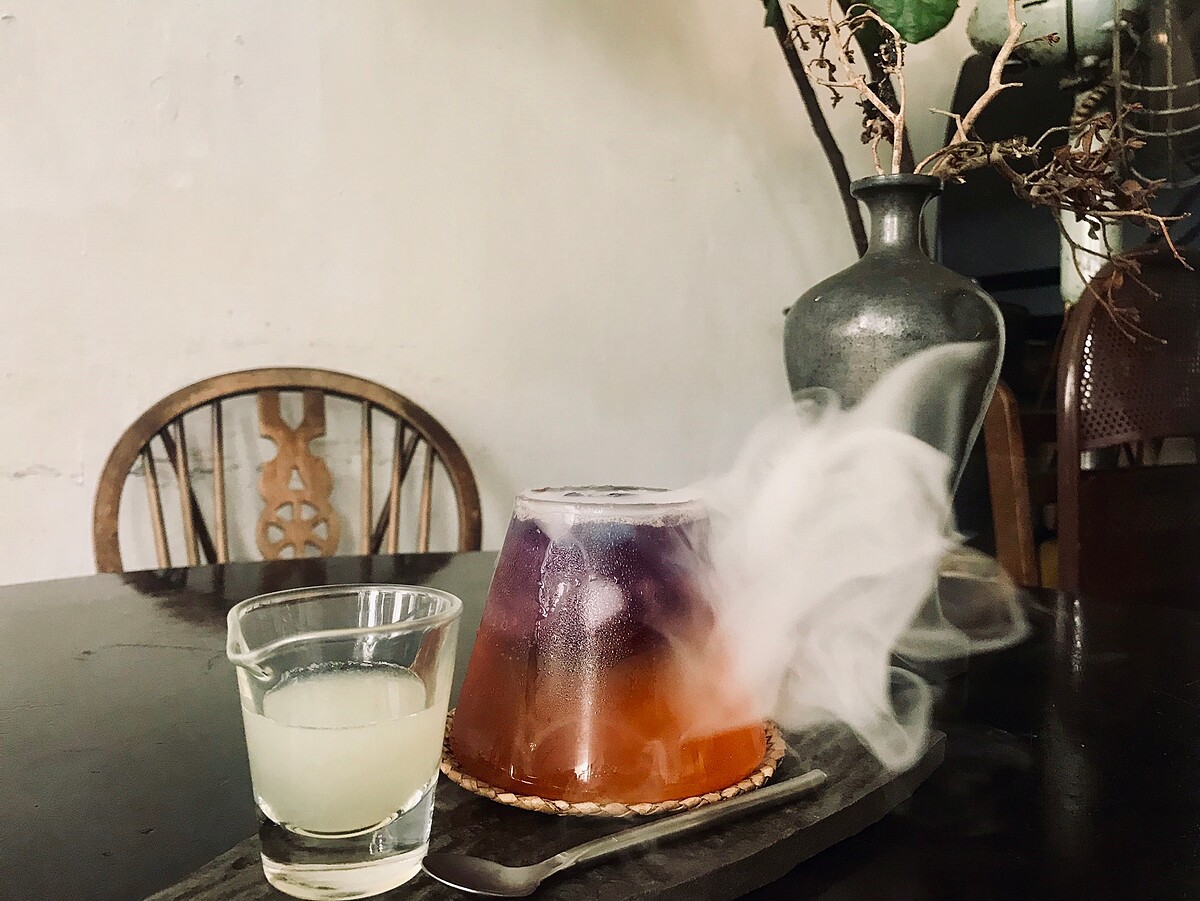 以Cascara咖啡果乾茶為基底搭配萊姆酒、紫蘇酒、梅酒調製而成。先使用可食用泡泡,通過SGS、MSDS安全檢驗認證,再泡泡中注入薄荷煙燻草,當泡泡破掉的瞬間煙緩緩落入飲品當中,更增添了清新的煙燻香氣!