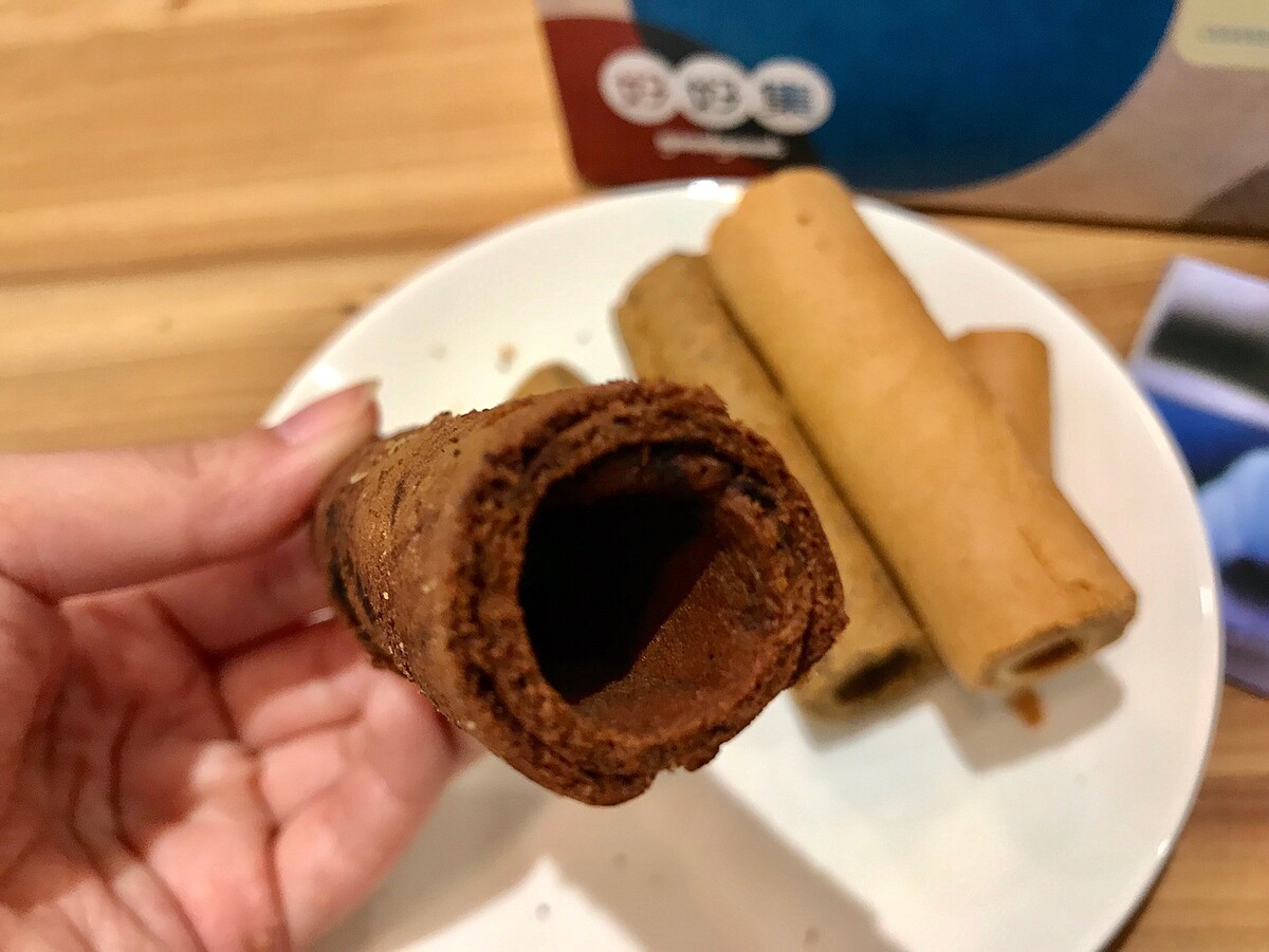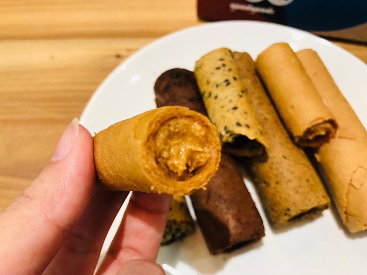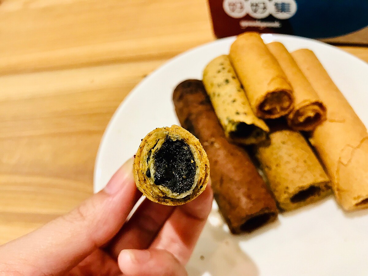 內容物:花生愛餡蛋捲x1、芝麻愛餡蛋捲x1、巧克力蛋捲x2鐵觀音蛋捲x2、激厚原味蛋捲x4。