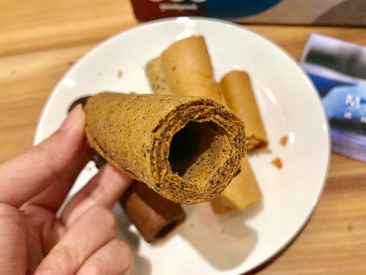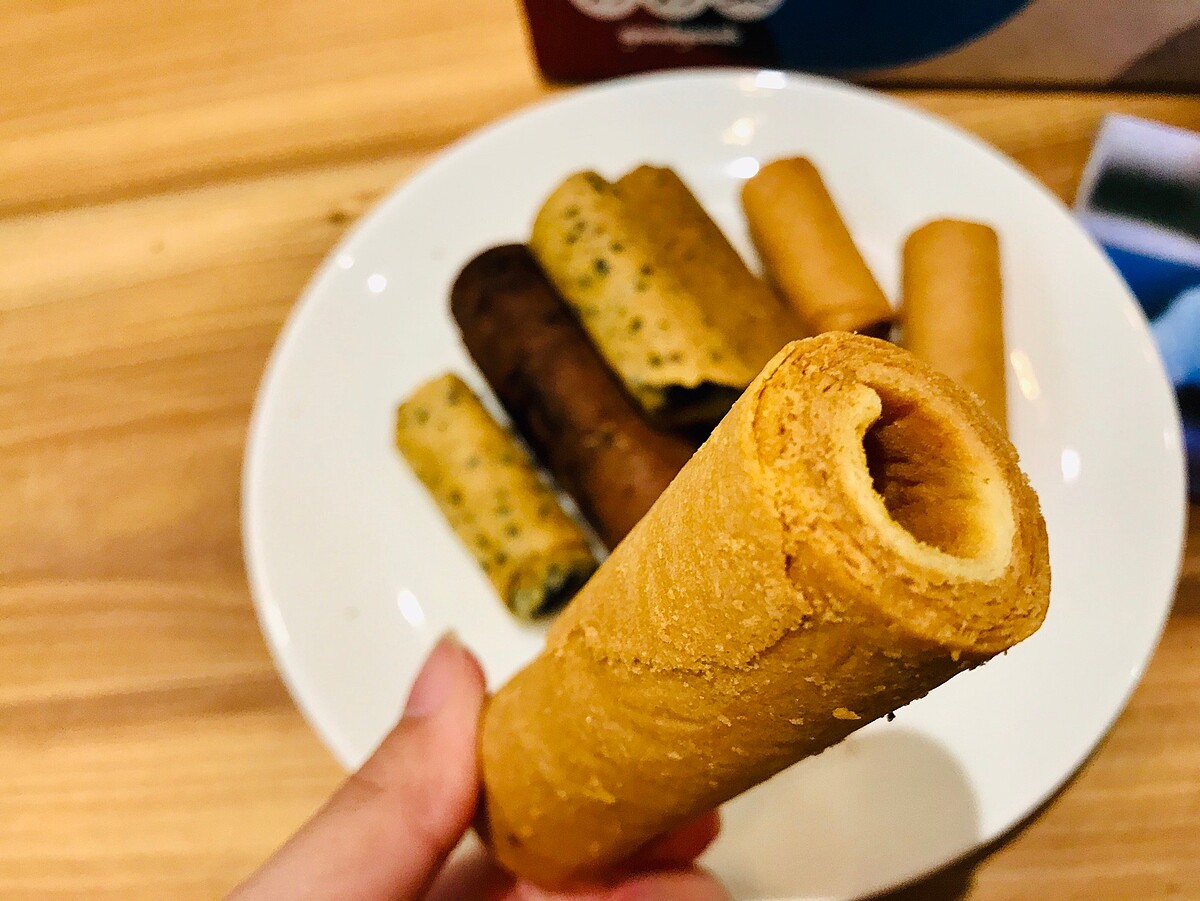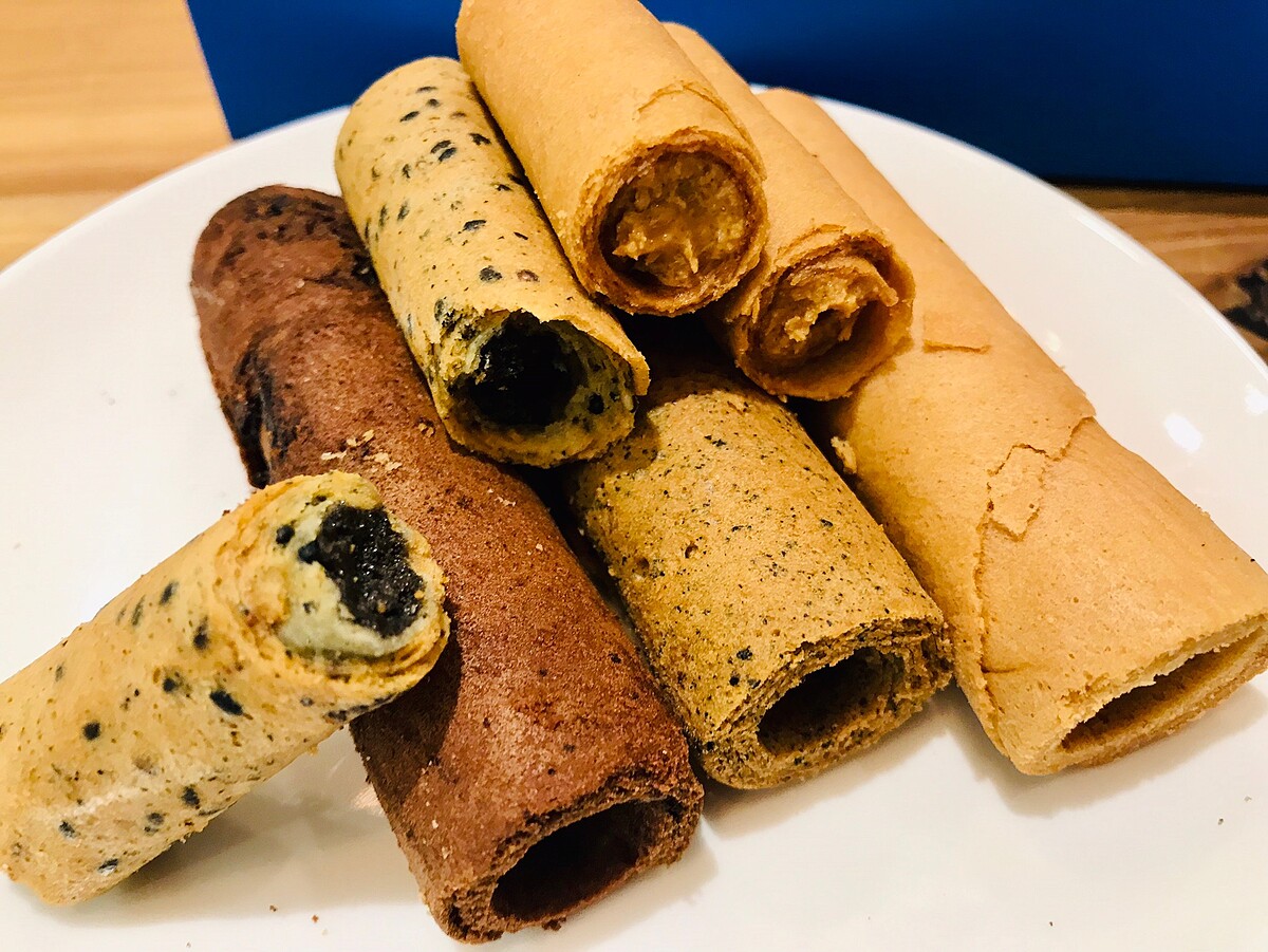 內容物:花生愛餡蛋捲x1、芝麻愛餡蛋捲x1、巧克力蛋捲x2鐵觀音蛋捲x2、激厚原味蛋捲x4。