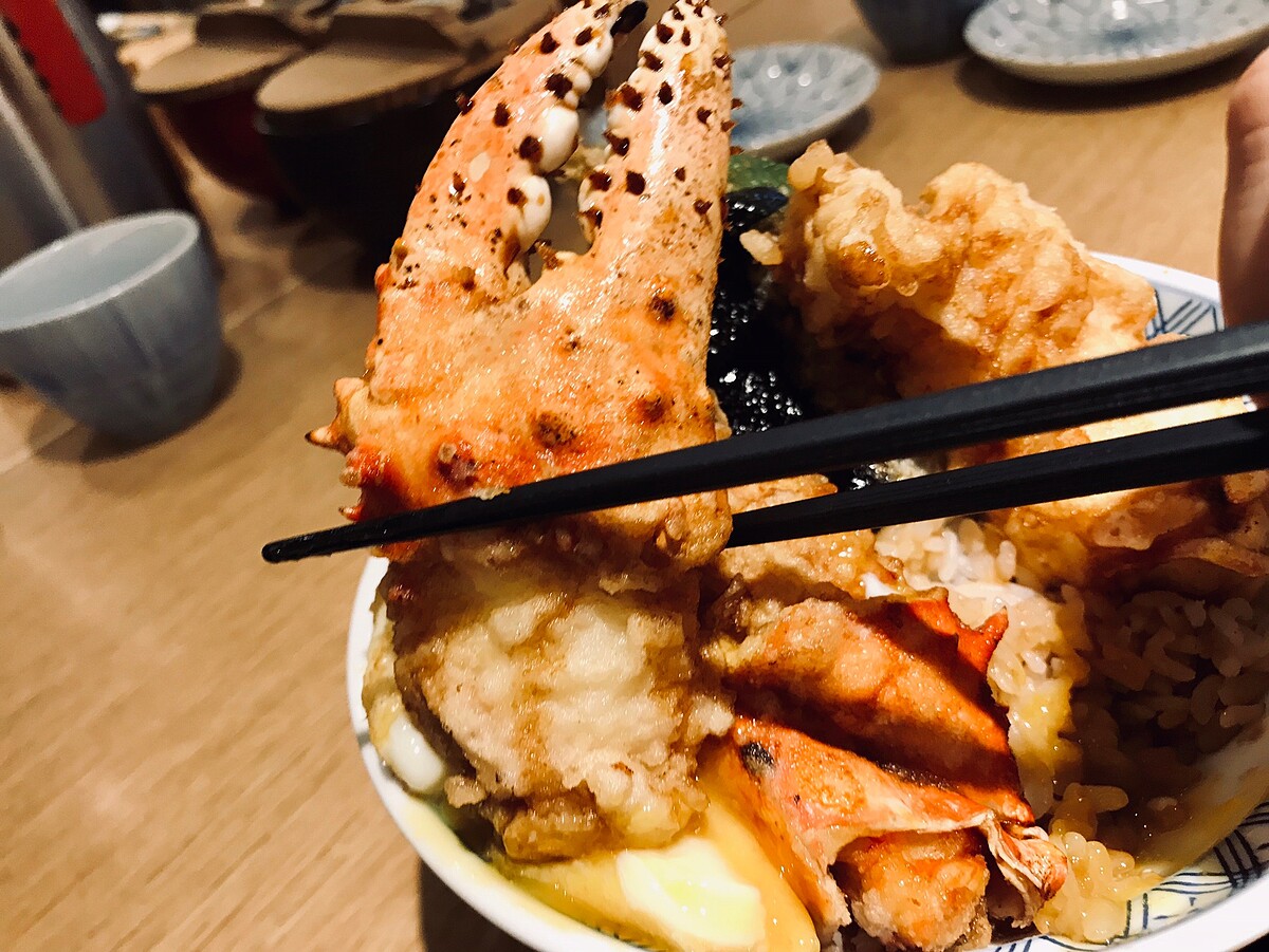 一碗美味的「帝王蟹天丼」來自金子半之助的職人炸手們將帝王蟹們一隻隻分解開殼,只保留最飽滿鮮甜的蟹螯及蟹腳,部位無法指定隨機出餐!