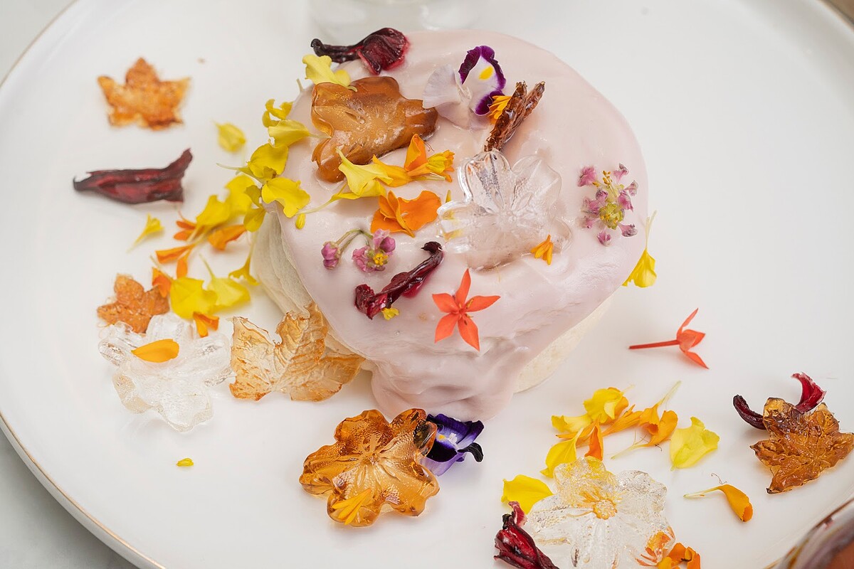 秋天是洛神花的季節,餐點使用當季的鮮豔如紅寶石般的洛神花為發想,製成洛神花乾點綴,以手工製作的花朵糖果裝飾,花朵糖果分別有原味及伯爵茶口味,非常特別~