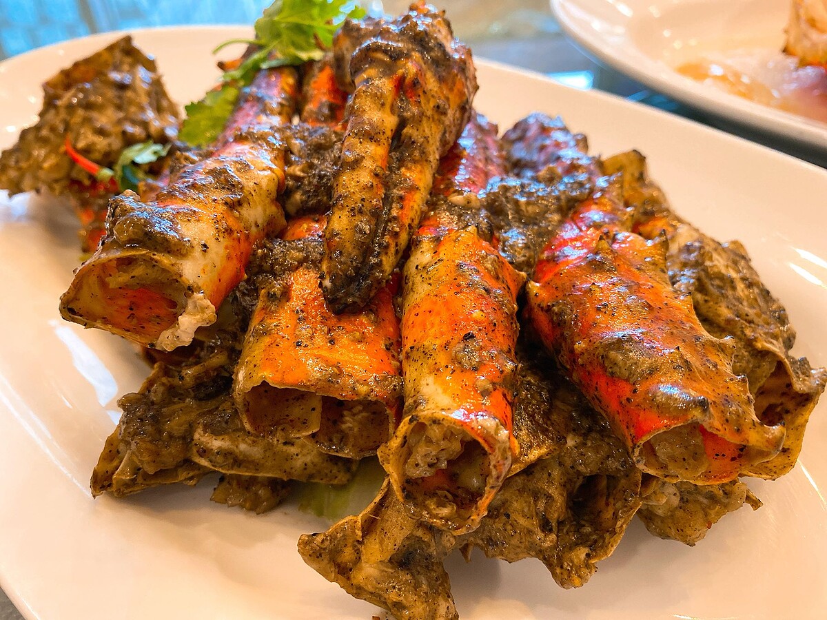 另外還有「帝王蟹全蟹三吃」,使用來自北太平洋的「蟹中之王」阿拉斯加帝王蟹,蟹腳、蟹身剖半兩吃,共有10種活蟹料理手法,包括招牌辣椒螃蟹,更有黑胡椒、白胡椒、花雕蛋白蒸、金沙、椒鹽焗、薑蔥炒、砂煲粉絲、奶油焗、金絲奶油等吃法,其中「金沙螃蟹」是把大沙公下鍋油炸,再取咖哩葉的香、朝天椒的辣,將鹹鴨蛋黃炒到起泡,讓香濃鹹甜的鹹鴨蛋均勻裹住蟹身,也是本店人氣吃法。