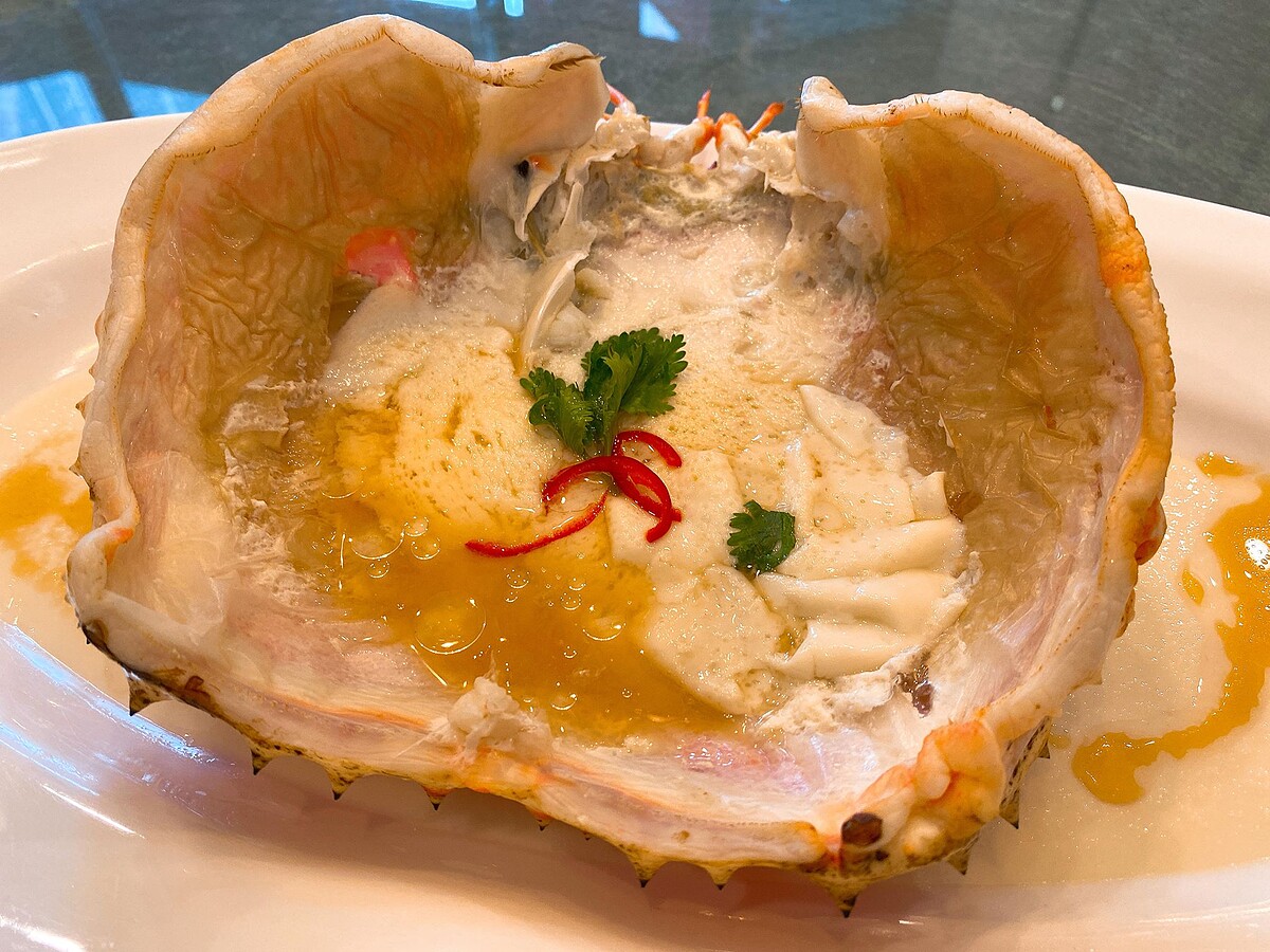 最後第三吃則是「花雕蛋白蒸螃蟹」,將帝王蟹殼拆下,打入蛋液加入豆漿,再滴入香醇陳年花雕酒清蒸,打造出淡淡酒香的蒸蛋蟹料理,11月優惠活動平日2.5-2.7公斤帝王蟹原價12200元,優惠8600元,2.8-3公斤帝王蟹原價14940元,優惠價9900元。