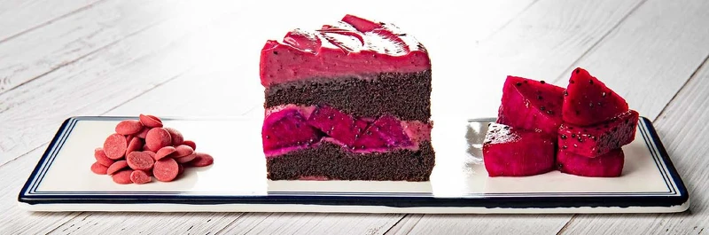 入口就能感受「粉紅圓舞曲」在口中苦甜交織的滋味,有別於一般巧克力蛋糕的甜膩,更增添了莓果香氣與酸甜感,搭配新鮮多汁的火龍果,口感更多層次,清爽度加倍~